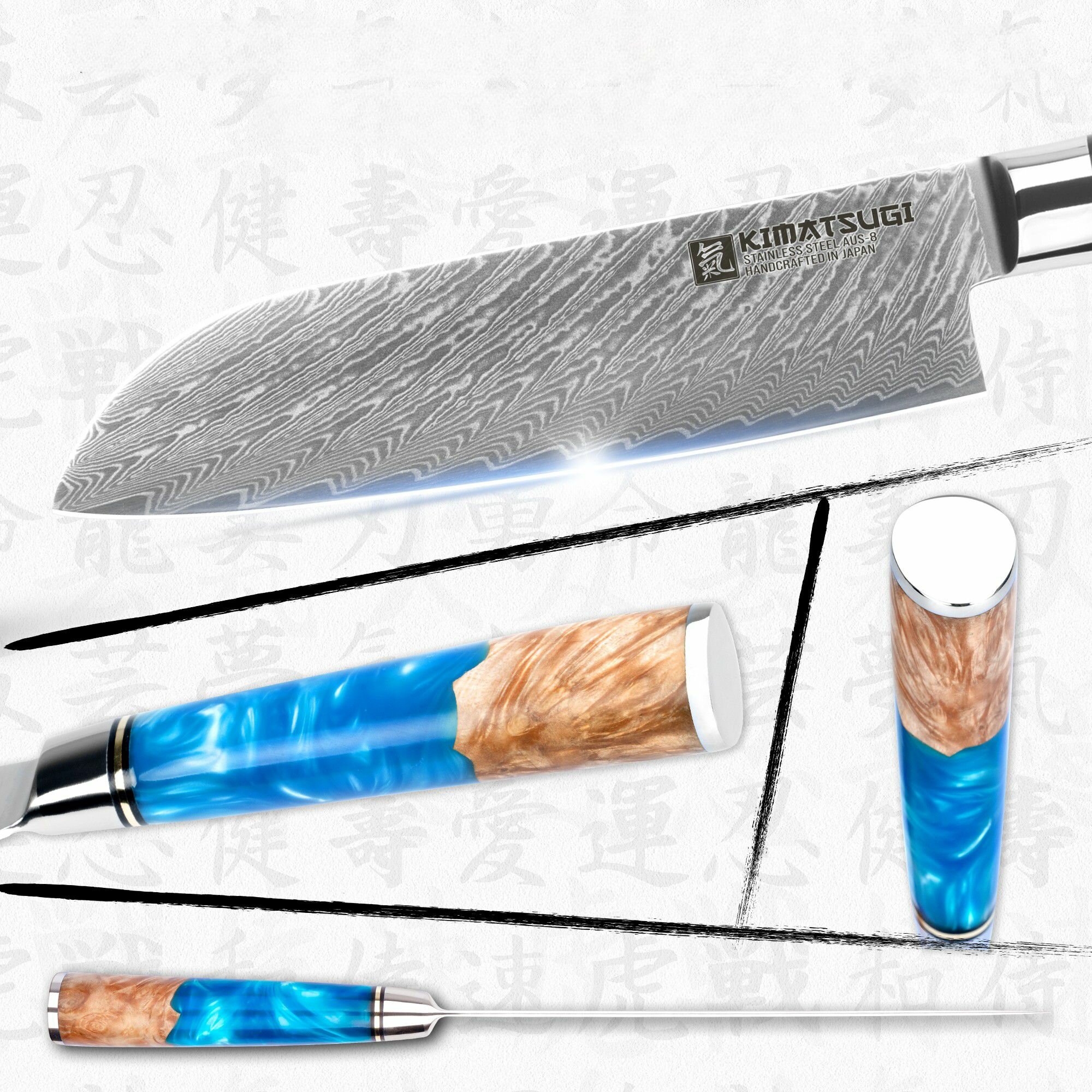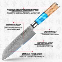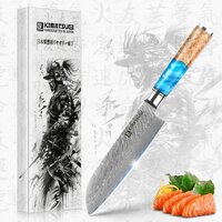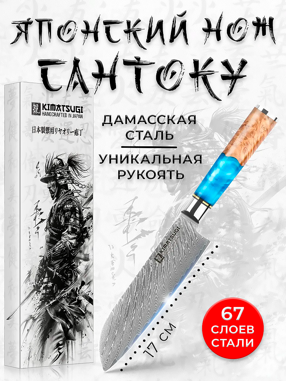Кухонный нож Сантоку от японского производителя Kimatsugi (серия Damascus #121) подходит для разделки птицы, кролика, рыбных туш, нарезки стейков и рубленого фарша, шинковки капусты, овощей, фруктов, слайсирования гастрономии и прочих задач повара.