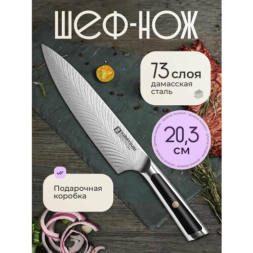 Поварской шеф-нож от японского производителя Kimatsugi (серия Damascus #125) подходит для разделки птицы, кролика, рыбных туш, нарезки стейков и рубленого фарша, шинковки капусты, овощей, фруктов, слайсирования гастрономии и прочих задач повара. Идеален для профессиональных поваров и домашнего использования благодаря балансу и многофункциональности.