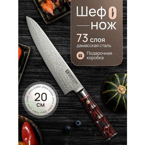 Поварской шеф-нож от японского производителя Kimatsugi (серия Damascus #133) подходит для разделки птицы, кролика, рыбных туш, нарезки стейков и рубленого фарша, шинковки капусты, овощей, фруктов, слайсирования гастрономии и прочих задач повара. Шеф-нож предназначен и для профессионального, и для домашнего применения.