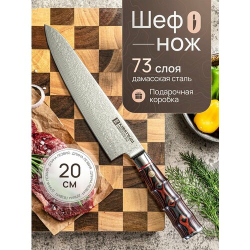 Поварской шеф-нож от японского производителя Kimatsugi (серия Damascus #133) подходит для разделки птицы, кролика, рыбных туш, нарезки стейков и рубленого фарша, шинковки капусты, овощей, фруктов, слайсирования гастрономии и прочих задач повара. Шеф-нож предназначен и для профессионального, и для домашнего применения.