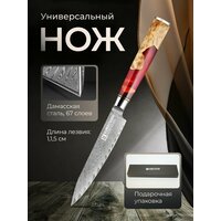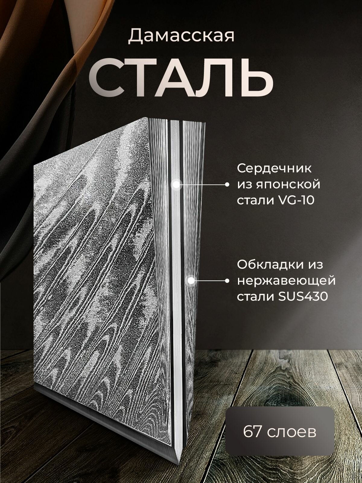 Лезвие профессионального ножа изготовлено из дамасской стали: центральный слой - из стали марки VG-10, 66 слоев боковых обкладок из стали SUS430.