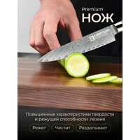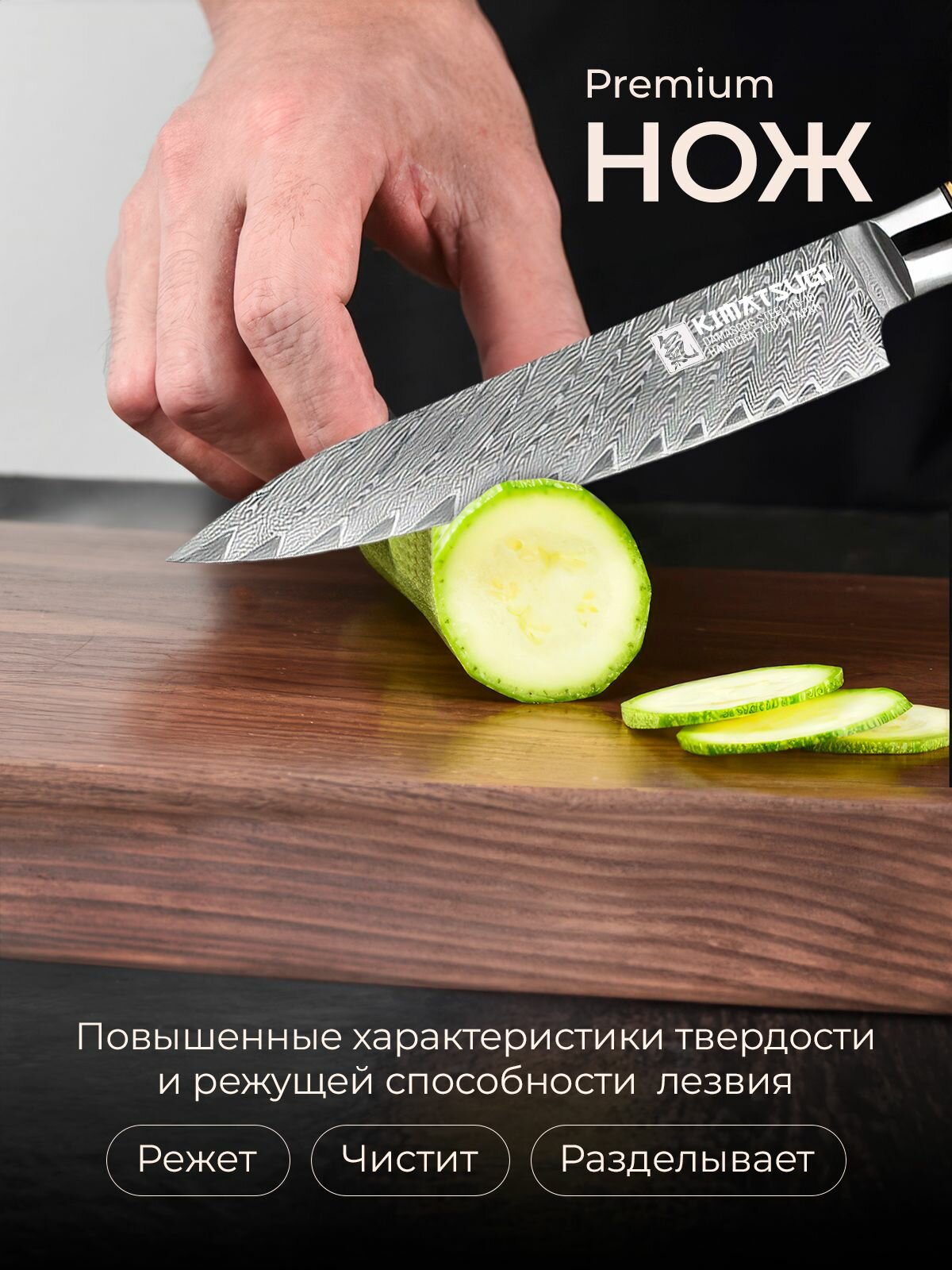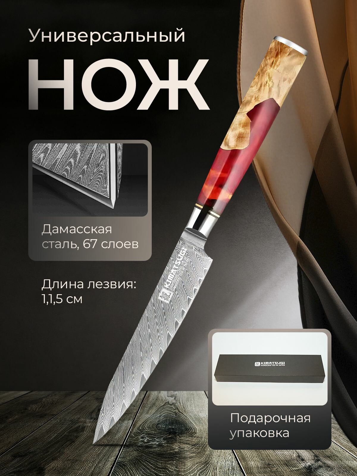 Универсальный кухонный нож от японского производителя Kimatsugi (серия Damascus #116) подходит для повседневной нарезки продуктов разной плотности — ветчины, сыра, ингредиентов для салата, рагу или супа, овощей и фруктов