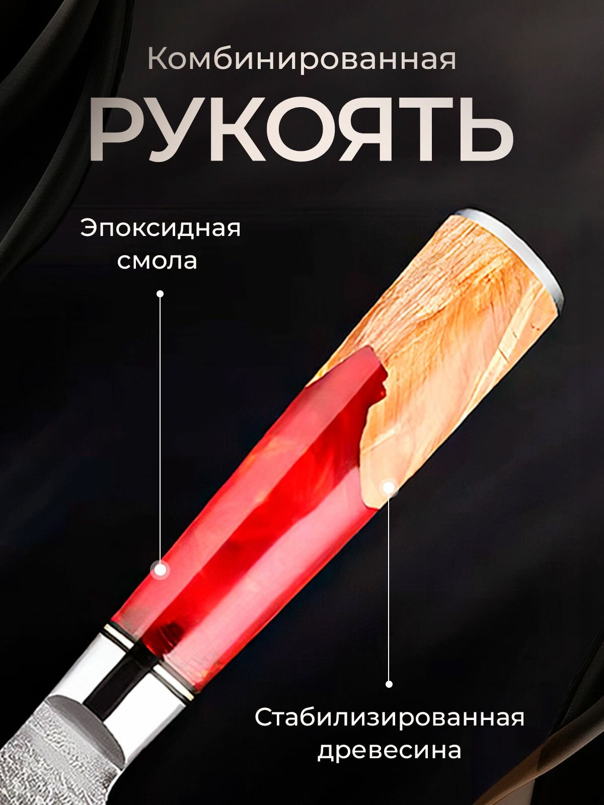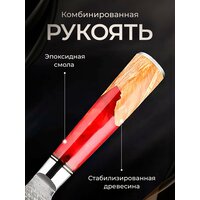 Рукоять, невероятно удобная, выполнена из из инновационного композитного материала (эпоксидная смола и стабилизированная древесина). Материал не впитывает влагу, не царапается, не стирается, устойчив к температурным перепадам и высоким нагрузкам. Рукоять приятная на ощупь, не натирает ладонь даже при долгой нарезке, так как умеет округлую форму и комфортно лежит в руке.