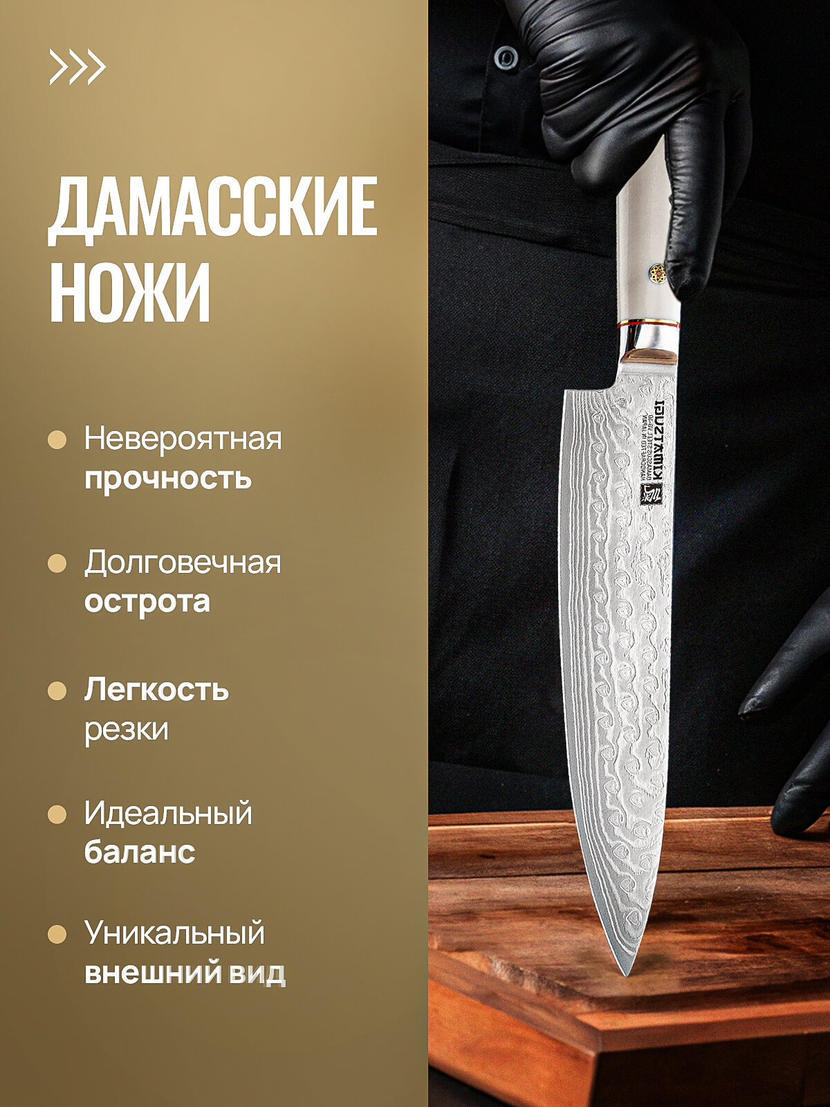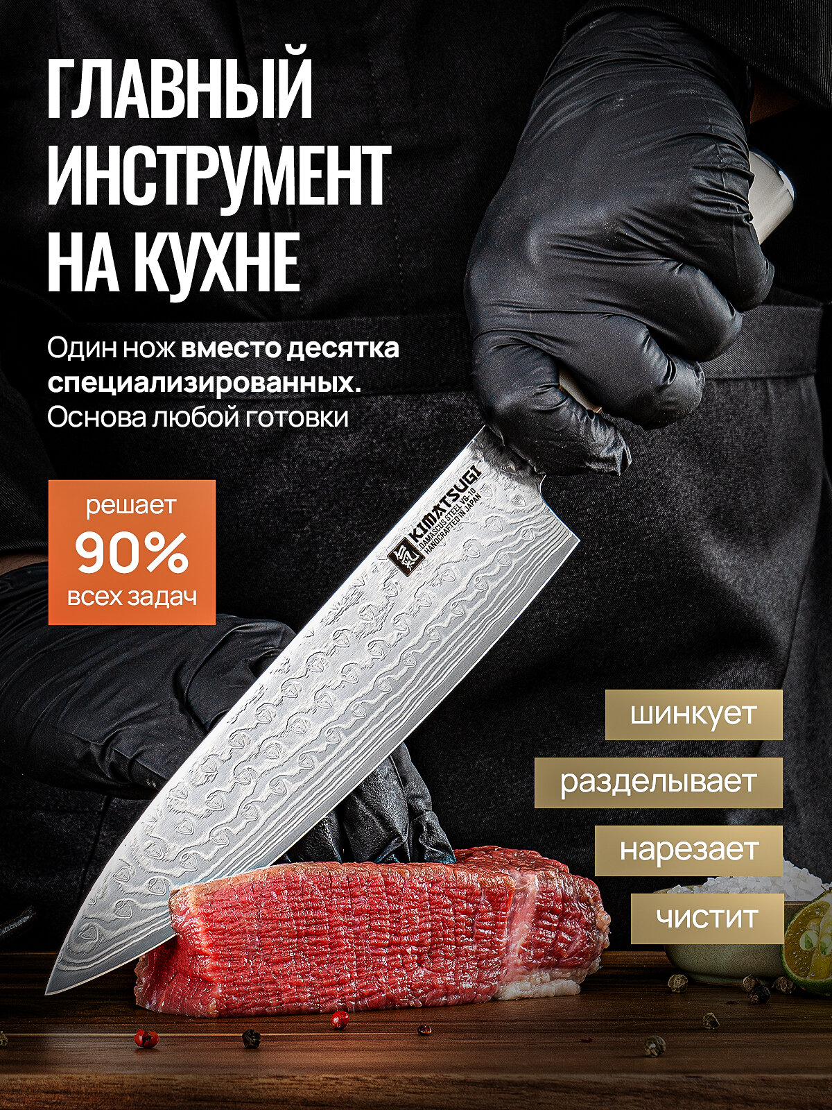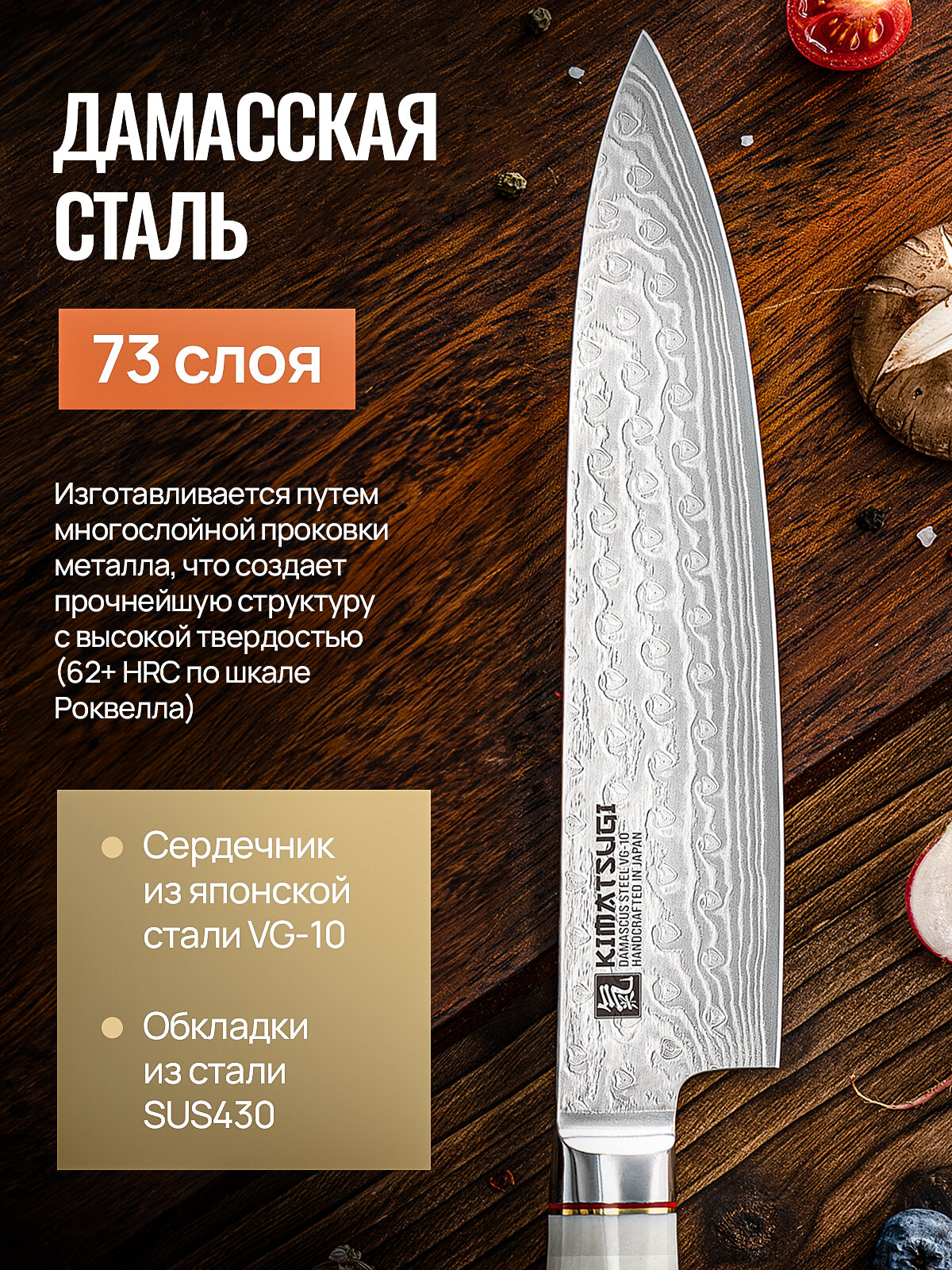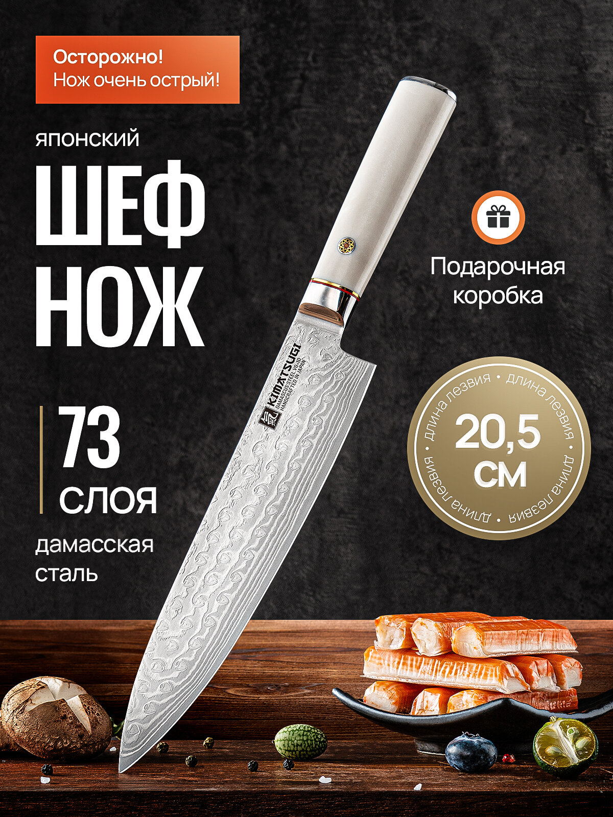 Купить Kimatsugi / Японский кухонный Шеф-нож Damascus #141. Настоящая дамасская сталь 73 слоя. VG-10 в обкладках. Длина лезвия 20,5 см. В подарочной коробке с доставкой по всей России. Kimatsugi / Японский кухонный Шеф-нож Damascus #141. Настоящая дамасская сталь 73 слоя. VG-10 в обкладках. Длина лезвия 20,5 см. В подарочной коробке: сравнение цен, характеристики, фото, актуальное наличие и цены.