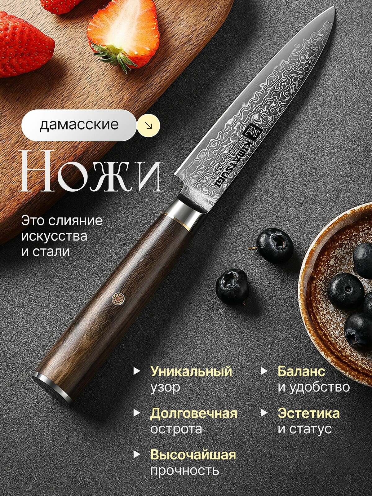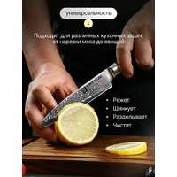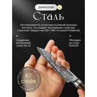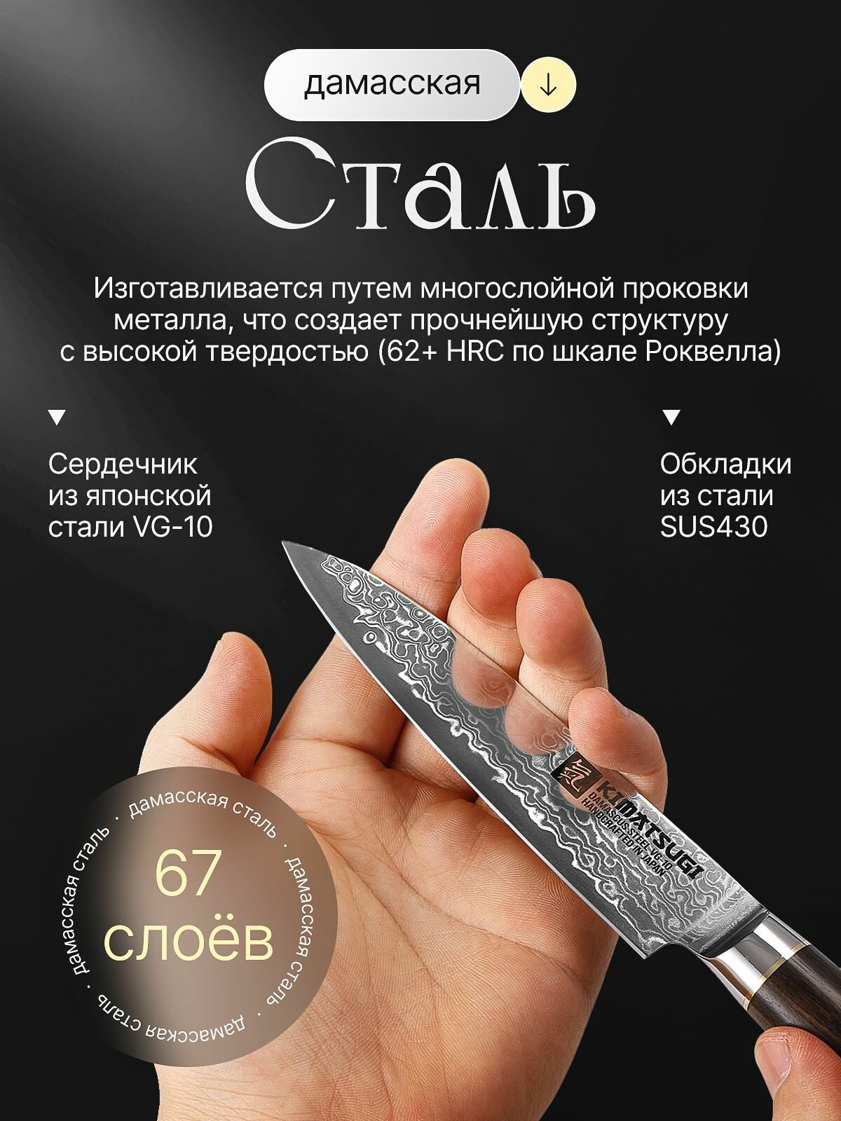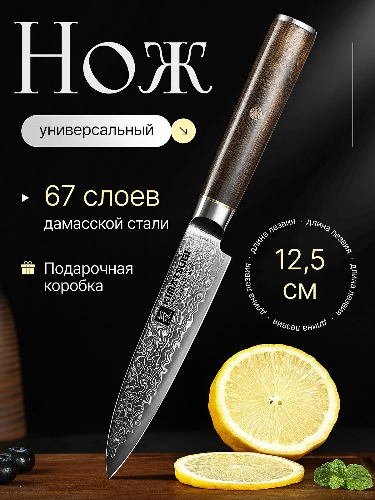 Kimatsugi / Японский Универсальный кухонный нож из дамасской стали VG-10 в обкладках 67 слоев. Длина лезвия 12,5 см. В подарочной коробке.: сравнение цен, характеристики, фото, актуальное наличие и цены.