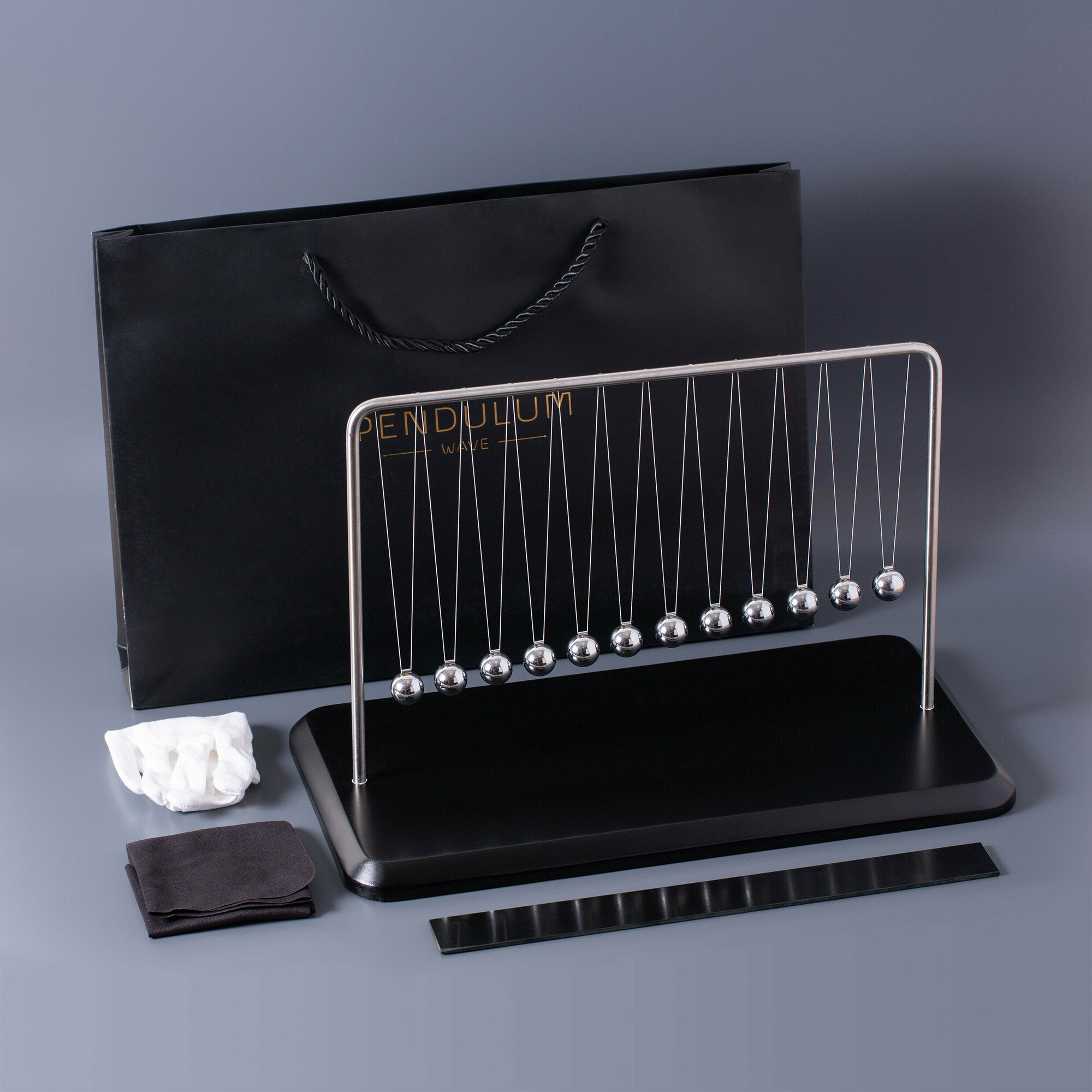 Кинетический маятник Волна - о тличный подарок. Маятник Волна станет прекрасным украшением рабочего места, благодаря своим плавным движениям поможет уменьшить напряжение во время больших нагрузок и настроиться на хороший лад. Высота маятника 25 см. Маятник упакован в подарочный пакет. Также в комплекте есть рычаг для запуска, салфетка из микромиры и перчатка для сборки маятника.