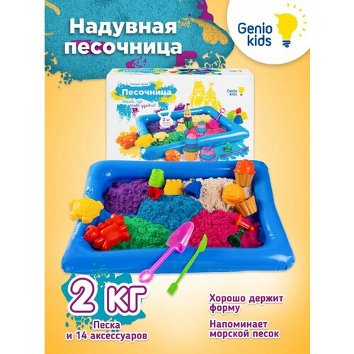 Умный песок Genio kids теперь с надувной песочницей и формочками! В наборе 2 кг цветного магического песка 5 цветов, 12 формочек, 1 совок, а также песочница (41*54 см), которая определит зону для игры с песком и поможет сохранить порядок в доме. Ребенок лепит, строит, фантазирует и одновременно развивает мелкую моторику, творческие способности и пространственное мышление. Волшебный песочек хорошо держит форму, не застывает, не липнет, приятный на ощупь, напоминает морской песок. Надувная песочница - удобный помощник для игры, её мягкие бортики берегут песок от высыпания. Песочницу можно разместить на полу, на детском столике, а также на траве. А при хранении она занимает немного места. Набор для лепки из космического кварцевого песок от Genio Kids станет хорошим подарком для мальчика и девочки. Сделано в Беларуси. Товар сертифицирован