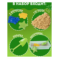Состав набора: кинетический умный песок - 1 кг, пластиковая песочница для веселой игры 20х30х6 см - 1 шт, формочки для создания морских обитателей (черепаха, морская звезда, краб) - 3 шт, лопатка - 1 шт.