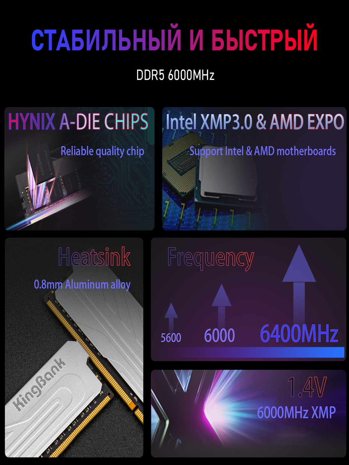 Модуль памяти Kingbank DDR5 6400MHz - отличное решение для тех, кто стремится повысить производительность своего настольного компьютера. Этот высококачественный модуль обладает объемом 32 ГБ, состоящим из двух планок по 16 ГБ, что обеспечивает невероятное количество оперативной памяти для множества задач одновременно. Поддержка стандарта DDR5 означает, что вы получите увеличенные скорости передачи данных и улучшенную энергоэффективность по сравнению с предыдущими поколениями, такими как DDR4.