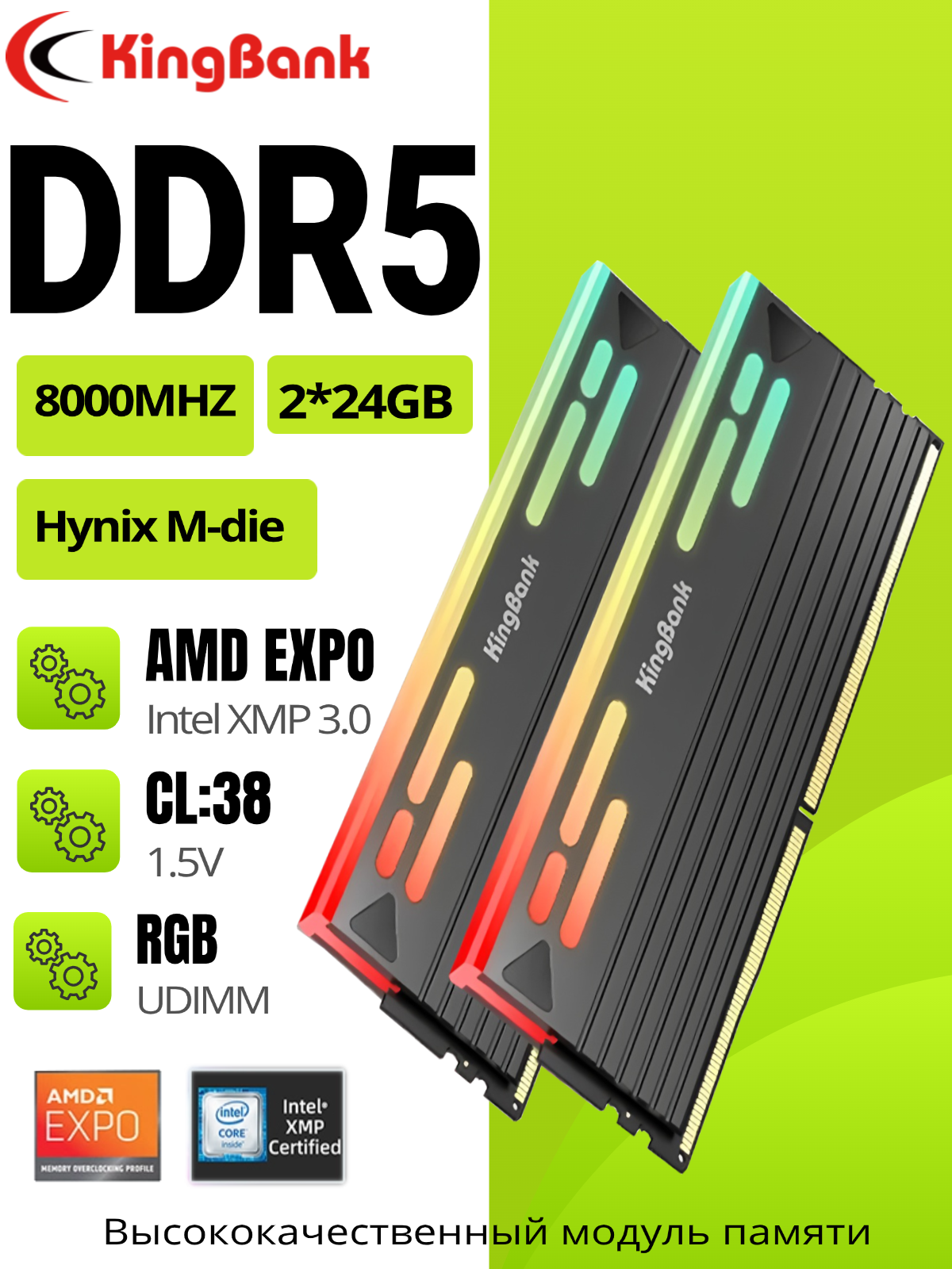 KingBank Модуль памяти KFRB series DDR5 8000MHz 24GB UDIMM Black Heatsink RGB (Hynix M-die C38)*2: сравнение цен, характеристики, фото, актуальное наличие и цены.