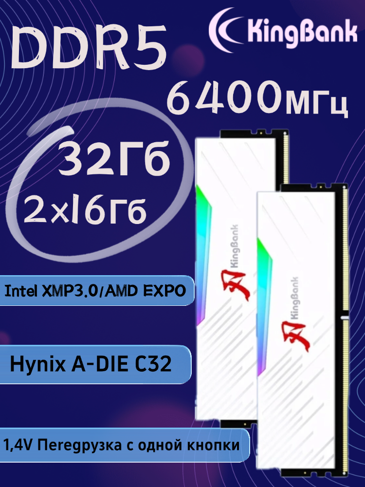 KingBank Оперативная память White Solarblade RGB DDR5 UDIMM 6800MHz 2*16ГБ White Heatsink(Hynix A-die C32/34): сравнение цен, характеристики, фото, актуальное наличие и цены.