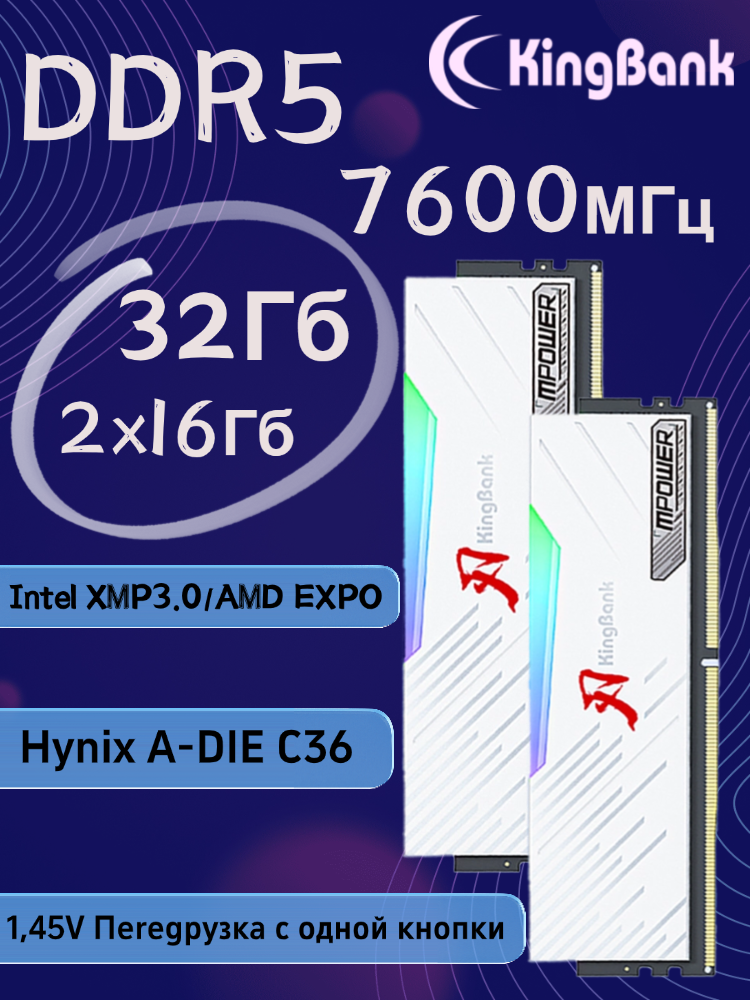 KingBank Оперативная память White Solarblade RGB DDR5 UDIMM 7600MHz White Heatsink (Hynix A-die C34) 2×16 ГБ: сравнение цен, характеристики, фото, актуальное наличие и цены.