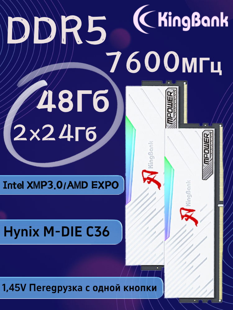 KingBank White Solarblade Модуль памяти DDR5 7600MHz 24GB UDIMM Heatsink White RGB DRAM(Hynix M-die C36)*2: сравнение цен, характеристики, фото, актуальное наличие и цены.