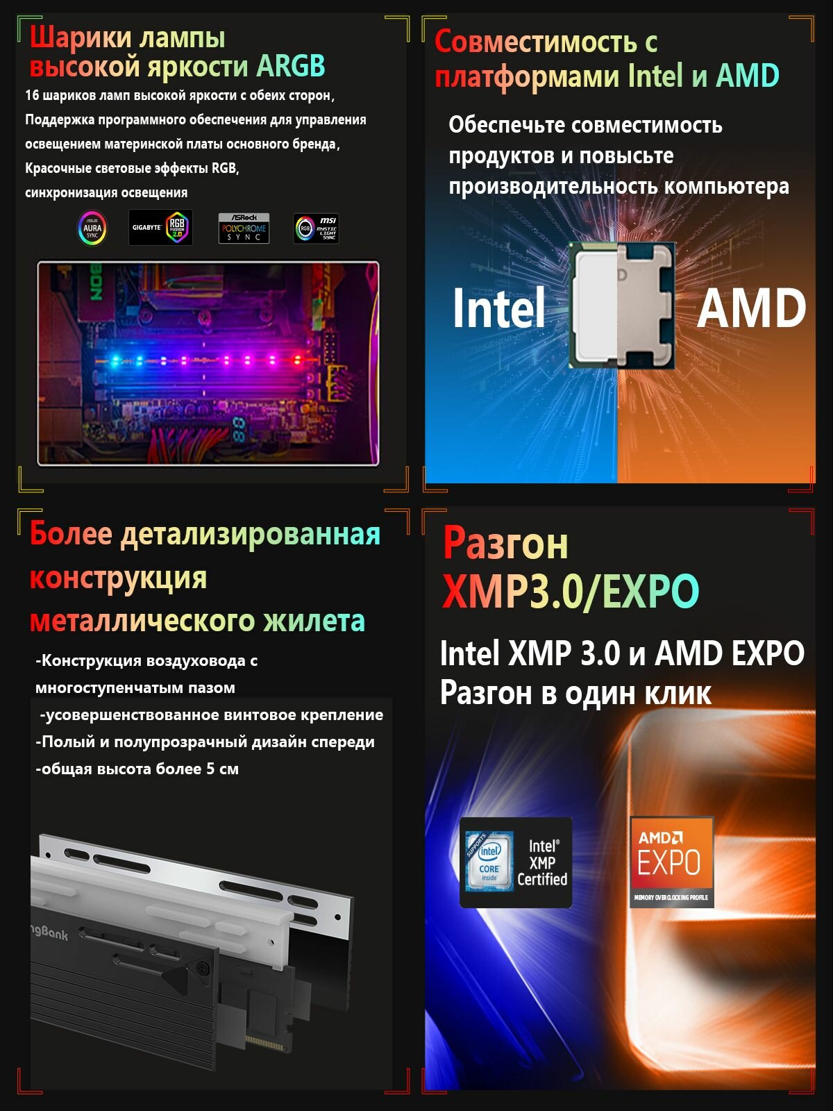 | Особенности | RGB-подсветка, XMP, игровая, радиатор |