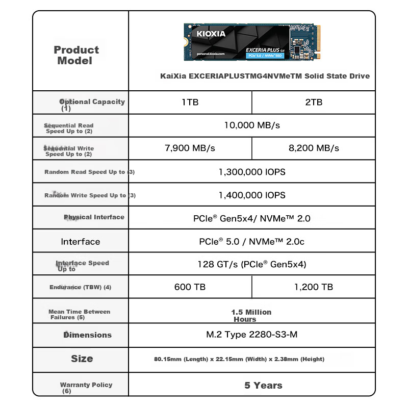 Kioxia 1TB SSD Solid State Drive NVMe M.2 Interface EXCERIA PLUS G4 VD10 Series (PCIE 5.0*4 Read Speed 10000MB/s): сравнение цен, характеристики, фото, актуальное наличие и цены.