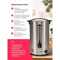 Кипятильник заливного типа (автономный) изготовлен из нержавеющей стали. Объём - 10л. Цельный корпус имеет двойные стенки: внутренняя - из нержавеющей стали 304, внешняя - из нержавеющей стали 304. Благодаря двойным стенкам внешняя поверхность аппарата не разогревается до обжигающей температуры.