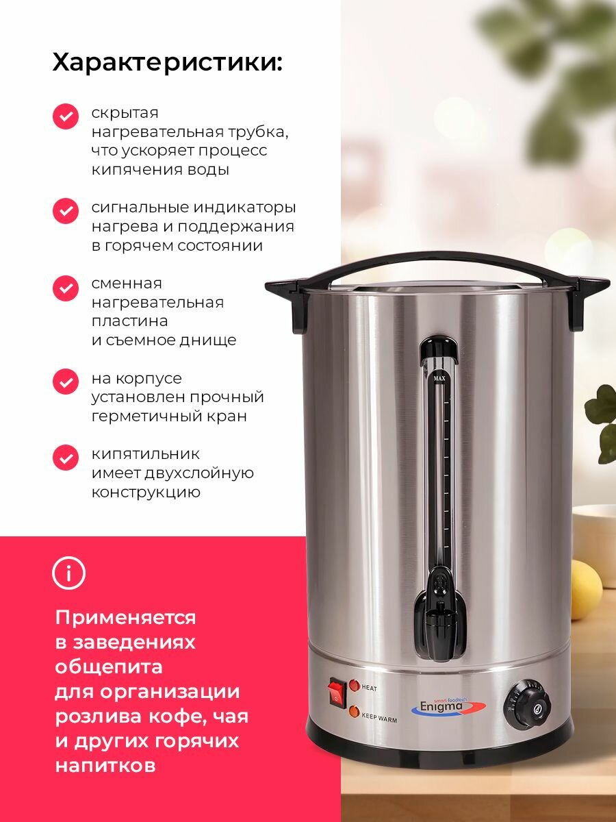 Электрокипятильник Enigma предназначен для нагрева воды и последующего поддержания ее заданной температуры. Он применяется в заведениях общепита (барах, кафетериях, кондитерских) для организации розлива кофе, чая и других горячих напитков. Он не требует подключения к водопроводу и обеспечит вас горячей водой повсюду, где есть электрические розетки 220 V. Кипятильник имеет стильный корпус с двойными стенками, изготовленный из нержавеющей стали, что обеспечивает полную безопасность . Объём: полный - 10л, полезный - 8л. Водонагреватель оснащён краном из нержавеющей стали для розлива, терморегулятором +30/+110С, сигнальными индикаторами нагрева и поддержания в горячем состоянии, шкалой уровня воды, выключателем "вкл./выкл.", съемным ТЭНом.