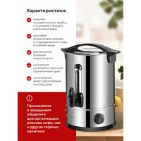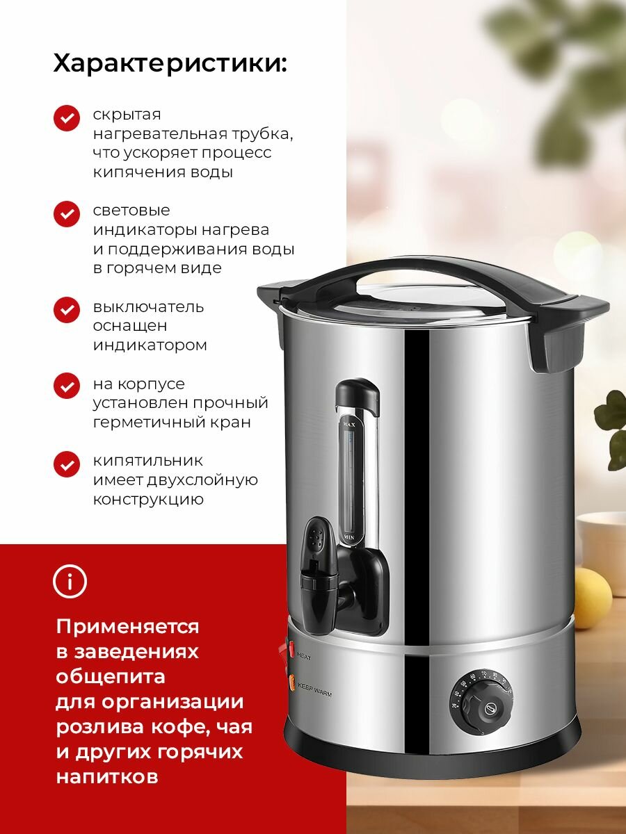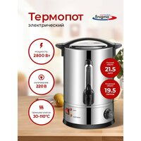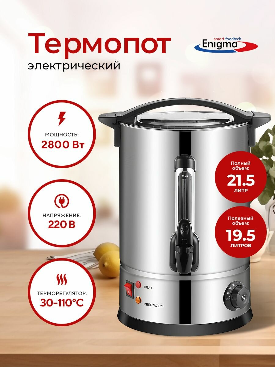 Электрокипятильник Enigma предназначен для нагрева воды и последующего поддержания ее заданной температуры. Он применяется в заведениях общепита (барах, кафетериях, кондитерских) для организации розлива кофе, чая и других горячих напитков. Он не требует подключения к водопроводу и обеспечит вас горячей водой повсюду, где есть электрические розетки 220 V. Кипятильник имеет стильный корпус с двойными стенками, изготовленный из нержавеющей стали, что обеспечивает полную безопасность. Объём: полный - 35л, полезный - 34л. Водонагреватель оснащён краном из нержавеющей стали для розлива, терморегулятором +30/+110С, сигнальными индикаторами нагрева и поддержания в горячем состоянии, шкалой уровня воды, выключателем "вкл./выкл.", съемным ТЭНом. Кипятильники-термопоты Enigma: Идеальное решение для вашего дома и офиса. Кипятильники-термопоты Enigma — это современные устройства, сочетающие в себе функции электрического чайника и термоса, обеспечивающие непрерывный доступ к горячей воде. Они становятся незаменимыми помощниками в быту и на работе благодаря своей многофункциональности, удобству использования и высокому уровню безопасности. В этом SEO-тексте мы расскажем о ключевых преимуществах кипятильников-термопотов Enigma и почему они должны стать частью вашего повседневного обихода. Преимущества кипятильников-термопотов EnigmaУдобство использования: Кипятильники-термопоты Enigma просты в эксплуатации благодаря интуитивно понятному интерфейсу и множеству удобных функций. Они оснащены электронным контролем температуры, что позволяет выбрать оптимальный режим нагрева воды для приготовления чая, кофе или других горячих напитков. Экономия времени и энергии: Благодаря большому объему резервуара, который может достигать 5 литров и более, кипятильники-термопоты Enigma обеспечивают непрерывный доступ к горячей воде в течение дня. Это особенно важно для офисов и больших семей, где требуется постоянный нагрев воды. Система энергосбережения и поддержания тепла позволяет существенно сократить затраты на электроэнергию. Высокий уровень безопасности: Кипятильники-термопоты Enigma оснащены современными системами безопасности, включая защиту от перегрева, автоматическое отключение и защиту от сухого кипячения. Эти функции гарантируют безопасную эксплуатацию устройства даже при длительном использовании. Стильный дизайн и материалы высокого качества: Корпус кипятильников-термопотов Enigma изготовлен из высококачественных материалов, обеспечивающих долговечность и стойкость к повреждениям. Стильный и эргономичный дизайн устройства идеально впишется в любой интерьер, будь то кухня, офис или зона отдыха. Многофункциональность: Помимо основной функции нагрева и поддержания температуры воды, многие модели кипятильников-термопотов Enigma обладают дополнительными возможностями, такими как таймер, дисплей с индикацией температуры, режимы быстрой фильтрации и функция памяти. Это делает их универсальными устройствами для любого дома или офиса. Области применения кипятильников-термопотов EnigmaДома: Кипятильники-термопоты Enigma станут отличным дополнением к кухонной технике, обеспечивая постоянный доступ к горячей воде для приготовления любимых напитков, детских смесей и даже быстрого приготовления пищи. Офисы: В условиях офиса, где важно поддерживать высокий у