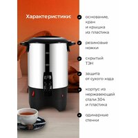 Водонагреватель оснащён пластиковым основанием, пластиковым краном для розлива, скрытым ТЭНом, защитой от сухого хода, шкалой уровня воды, выключателем "вкл./выкл." с индикатором, фиксирующейся пластиковой крышкой, резиновыми ножками.