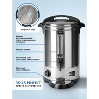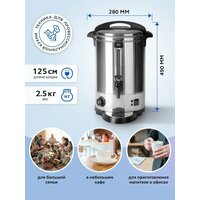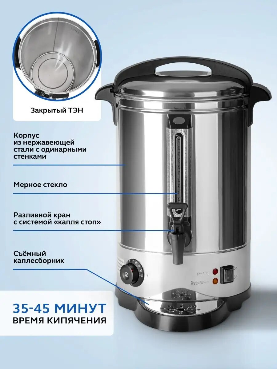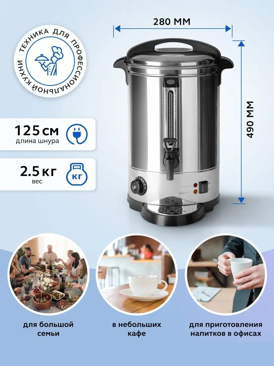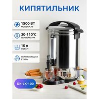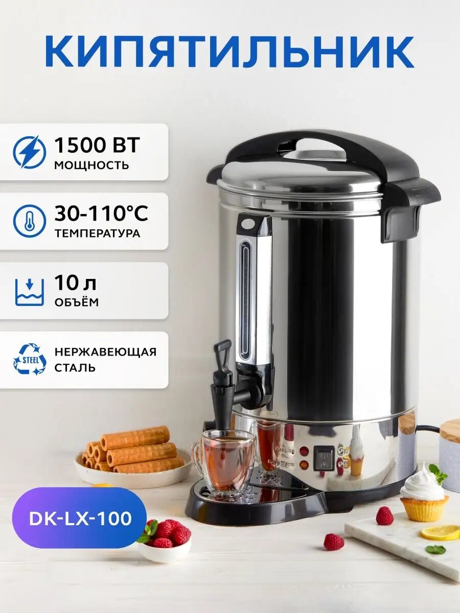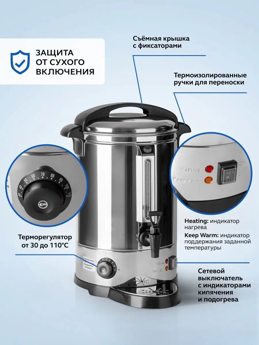 Большой электрический кипятильник термопот Gastrorag DK-LX-100 – это техника для профессиональной и домашней кухни, многофункциональный электро прибор, который совмещает функции кулера, чайника и термоса. Он предназначен для быстрого нагрева воды и поддержания ее температуры в течение длительного времени. Электрокипятильник заливного типа не требует подключения к водопроводу и обеспечит вас горячей водой повсюду, где есть электрические розетки 220 В. Настольный кипятильник-термопот объемом 10 л оптимален для линий раздачи предприятий общественного питания: ресторанов, кафе, столовых, закусочных. Он также идеально подойдет для приготовления горячих напитков в барах и оснащения детских садиков, школ, офисов и больниц. А в доме большой семьи он с успехом заменит бытовой электрический термочайник. На вашей кухне всегда будет запас горячей воды для приготовления блюд, напитков, детского питания. Мощность ТЭНа составляет 1500 Вт, время кипячения - 35-45 минут в зависимости от начальной температуры воды. После закипания воды в целях экономии электроэнергии термопот автоматически переходит в режим подогрева, периодически включается и выключается для поддержания температуры. Наливной кипятильник для воды Gastrorag имеет прочный корпус из нержавеющей стали и черного пластика с двумя удобными термоизолированными ручками для переноски. Стенки корпуса одинарные. Съемная крышка имеет фиксаторы для безопасного использования. Кипятильник оснащен регулятором температуры и защитой от сухого включения. Регулировка температуры осуществляется в пределах от 30 до 110оС. В положении 110оС кипение воды будет непрерывным. Закрытый ТЭН не соприкасается с питьевой водой, что упрощает процедуру ухода и очистки от накипи. Уровень воды в баке легко визуально контролировать благодаря мерному стеклу. Розлив воды осуществляется через пластмассовый кран с системой "капля стоп".