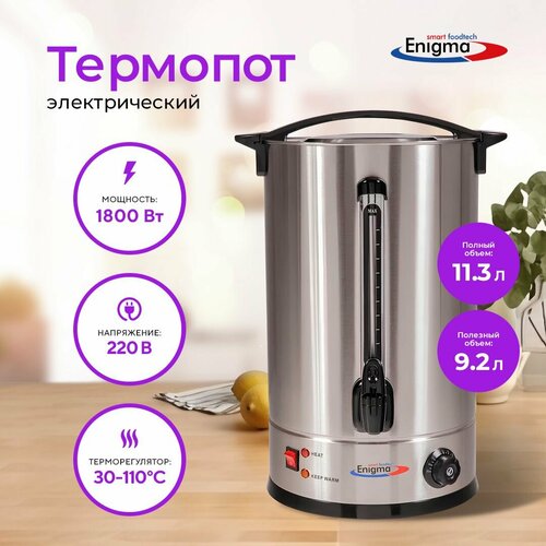 Электрокипятильник Enigma предназначен для нагрева воды и последующего поддержания ее заданной температуры. Он применяется в заведениях общепита (барах, кафетериях, кондитерских) для организации розлива кофе, чая и других горячих напитков. Он не требует подключения к водопроводу и обеспечит вас горячей водой повсюду, где есть электрические розетки 220 V. Кипятильник имеет стильный корпус с двойными стенками, изготовленный из нержавеющей стали, что обеспечивает полную безопасность . Объём: полный - 11,3л, полезный - 9,2л. Водонагреватель оснащён краном из нержавеющей стали для розлива, терморегулятором +30/+110С, сигнальными индикаторами нагрева и поддержания в горячем состоянии, шкалой уровня воды, выключателем "вкл./выкл.", съемным ТЭНом.