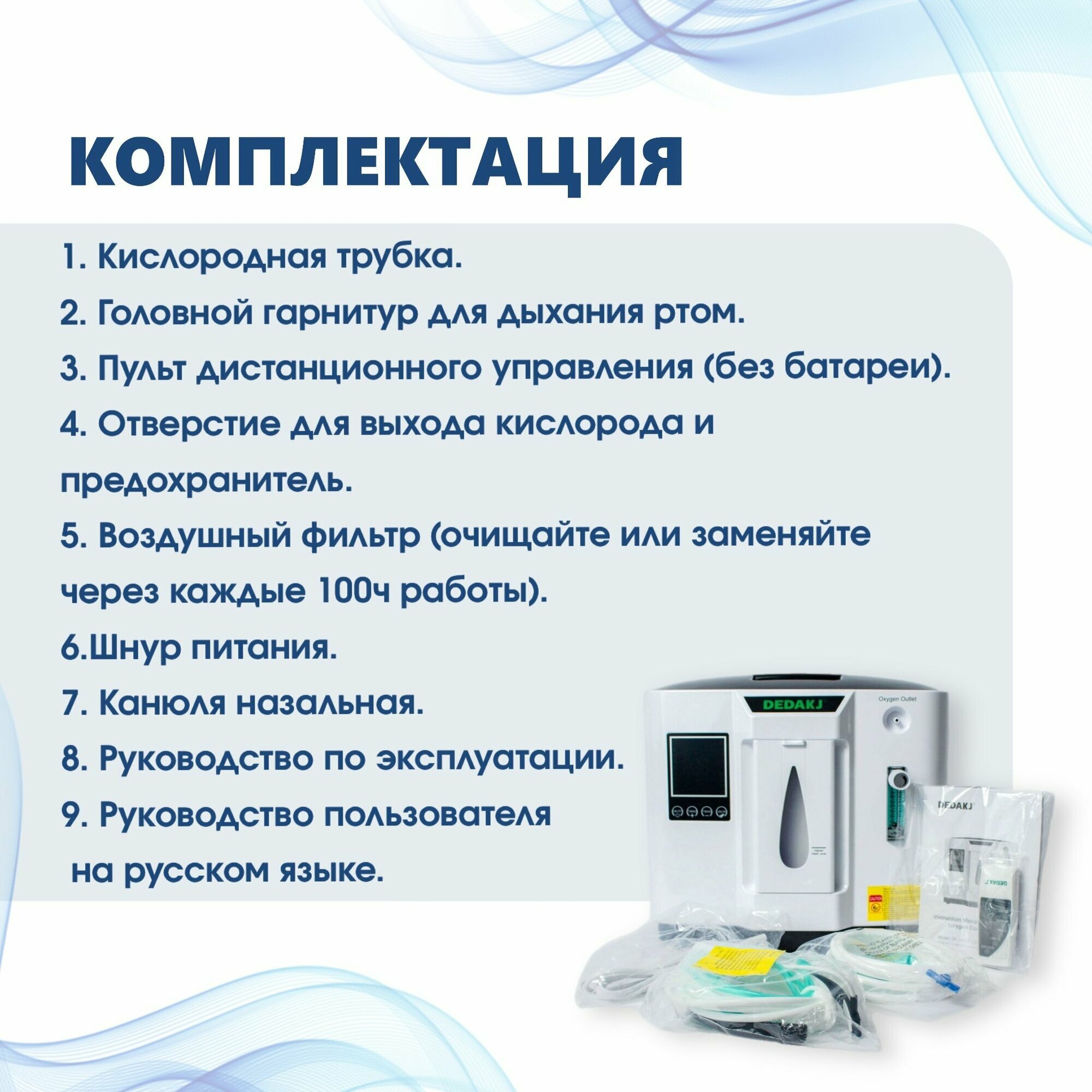 1. Кислородная трубка. 2. Головной гарнитур для дыхания ртом. 3. Пульт дистанционного управления (без батареи). 4. Отверстие для выхода кислорода и предохранитель. 5. Воздушный фильтр (очищайте или заменяйте через каждые 100ч работы). 6.Шнур питания. 7. Канюля назальная. 8. Руководство по эксплуатации. 9. Руководство пользователя на русском языке.