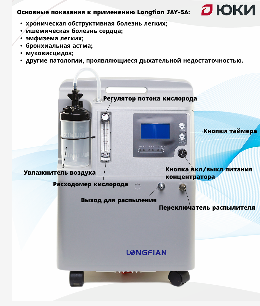 Концентратор кислорода Longfian JAY-5A — оборудование для проведения кислородной терапии при заболеваниях сердечно-сосудистой системы, легких и других патологических состояниях, при которых снижается концентрация кислорода в крови. С помощью Longfian JAY-5A врачи проводят кислородную терапию в больницах. Возможно применение аппарата в домашних условиях при хронических болезнях.