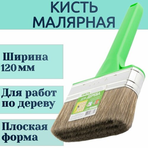 Кисть 120x25 мм для работ по дереву, смешанная серая щетина, пластиковая эргономичная ручка. Позволяет равномерно прокрасить большие плоские поверхности, стены и потолки.
