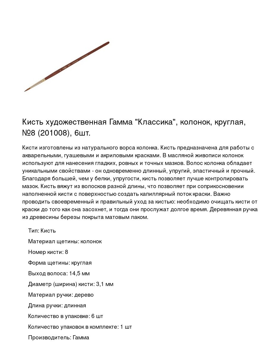 Кисть художественная Гамма «Классика», колонок, круглая, №8 (201008), 6шт.: сравнение цен, характеристики, фото, актуальное наличие и цены.