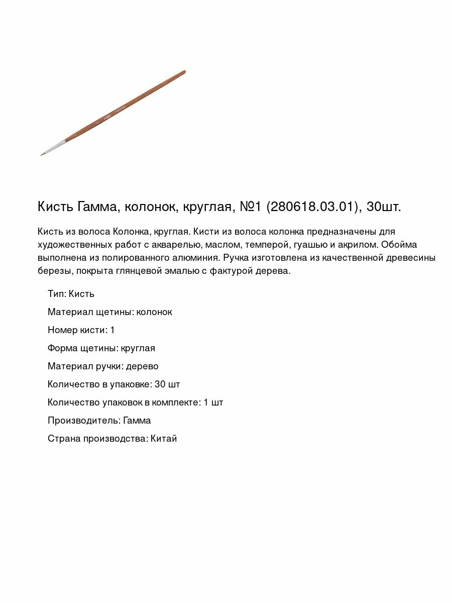 Купить Кисть Гамма, колонок, круглая, №1 (280618.03.01), 30шт. с доставкой по всей России. Кисть Гамма, колонок, круглая, №1 (280618.03.01), 30шт.: сравнение цен, характеристики, фото, актуальное наличие и цены.
