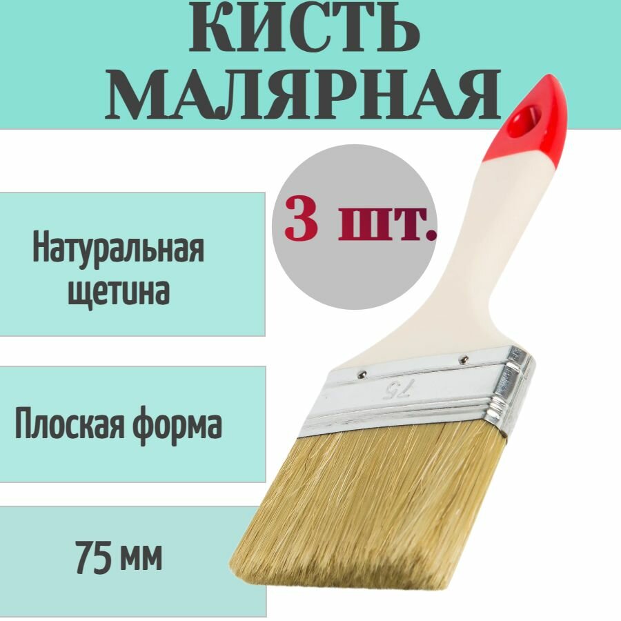 Купить Кисть малярная плоская 75 мм, 3 шт, натуральная щетина — для нанесения красок любого типа, в том числе алкидных, нитроцеллюлозных и масляных, а также грунтовок и защитных составов с доставкой по всей России.