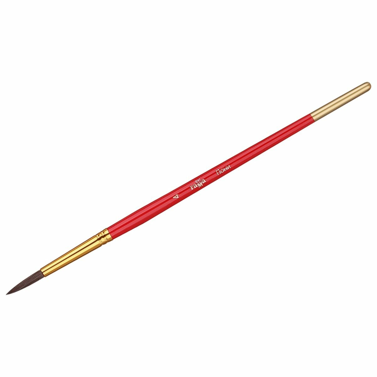 Кисть Гамма, пони, круглая, №4 - это высококачественный инструмент для рисования. Волоски кисти изготовлены из волоса пони, который обладает средней жёсткостью. Это делает его близким к мягкому, но при этом волоски надежные и долговечные, что гарантирует долгий срок службы кисти.