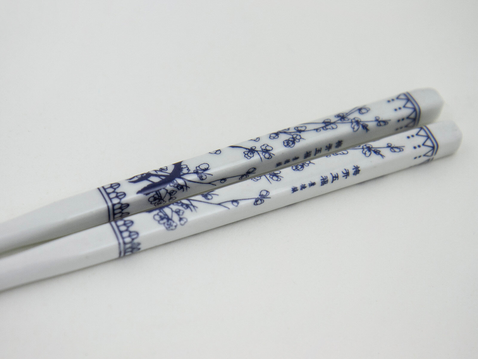 Технологические допуски. Рисунок наносится вручную, возможны смещения до ±2 мм и лёгкая вариация оттенка глазури; толщина палочек может отличаться до 0,3 мм — это норма для фарфора и не влияет на прочность или удобство.