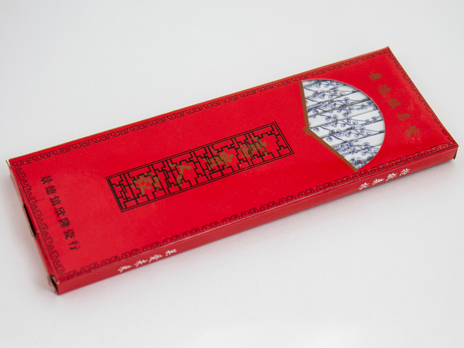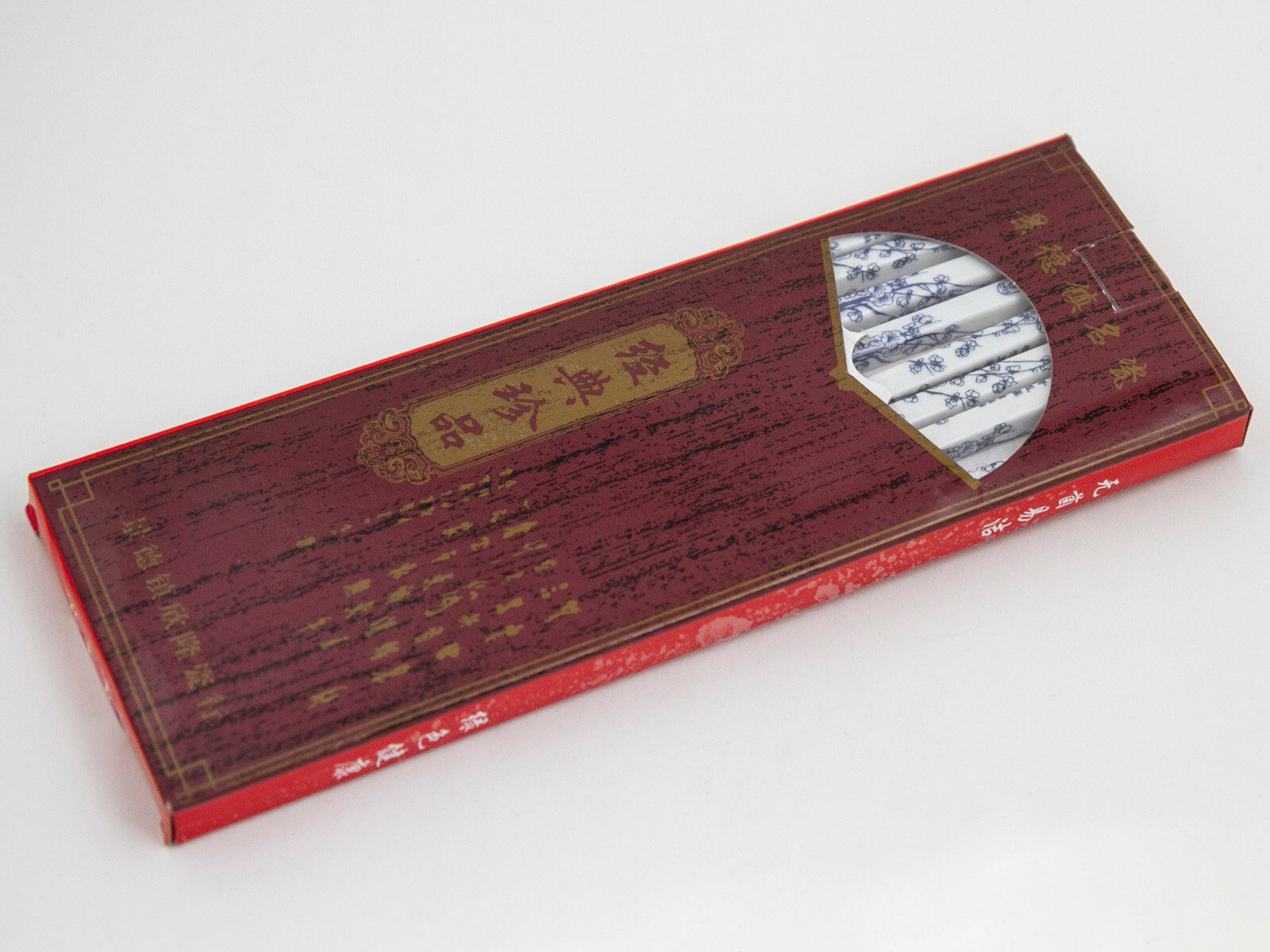 Упаковка. Палочки поставляются в плоской красной картонной коробке‑конверте. Для безопасной доставки каждые несколько пар дополнительно оборачиваются пузырчатой плёнкой. Подарочной коробки нет.