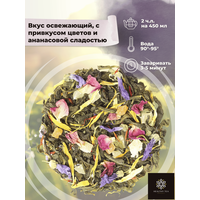 Состав: Китайский зеленый крупнолистовой чай, кусочки ананаса, лепестки розы, красного и синего василька и календулы.