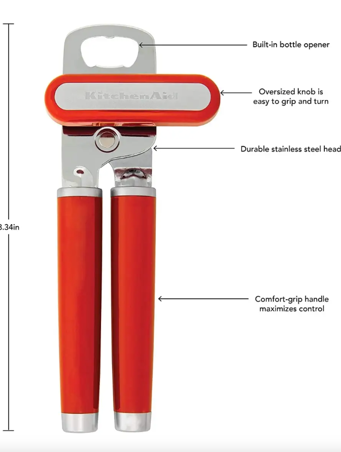 Лезвие из нержавеющей стали: Консервный нож KitchenAid изготовлен из прочной нержавеющей стали 420 J2, которая предназначена для легкого прокалывания и открывания всех типов банок и бутылок встроенная открывалка для бутылок: Встроенная открывалка для бутылок встроена в головку открывалки для банок легко поворачиваемая ручка: Большая, легко поворачиваемая ручка открывалки для консервов облегчает открывание банок эргономичные ручки для комфорта: Этот консервный нож прочный и оснащен эргономичными ручками, обеспечивающими надежный захват легкий уход: Ручная стирка теплой водой с мягким моющим средством, промойте и высушите сразу после использования.