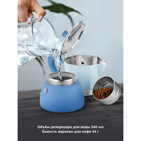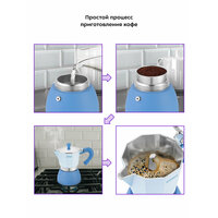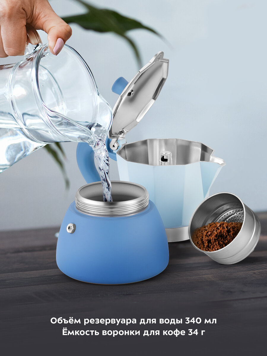 Гейзерная кофеварка поможет приготовить чёрный кофе. Преимущество такой кофеварки в простоте приготовления кофе. В сравнении с туркой, при приготовлении кофе в гейзерной кофеварке нет необходимости следить за поднятием пенки, а кофе не содержит гущи. В резервуар наливают воду и устанавливают воронку с фильтром, куда добавляют молотый кофе. Сверху накручивается резервуар для кофе. Далее кофеварку помещают на плиту. Вода нагревается, пар вытесняет горячую воду через фильтр, и получается вкусный кофе. В воронку с фильтром кофеварки КТ-7151 помещается около 34 грамм кофе, а ёмкость резервуара для воды – 340 мл. Она рассчитана на приготовление 6 чашек по 40 мл. В комплекте к кофеварке идут воронка с фильтром, куда непосредственно добавляется молотый кофе, и фильтр резервуара для кофе, который предотвращает попадание гущи в напиток. Гейзерная кофеварка КТ-7151 подходит для использования на газовых, индукционных, электрических и инфракрасных плитах. Рекомендуется включать плиту на среднюю мощность при заваривании кофе. Разберите кофеварку на составные части. Для этого открутите резервуар для кофе от резервуара для воды. Вытащите воронку с фильтром и вытряхните кофейный жмых. Промывайте все детали тёплой проточной водой. Гейзерная кофеварка КТ-7151 приготовит кофе всего за несколько минут. Кофеварка компактная и простая в использовании. Она идеально подойдёт для приготовления кофе в домашних условиях или на даче, а стильный дизайн будет радовать вас каждое утро!