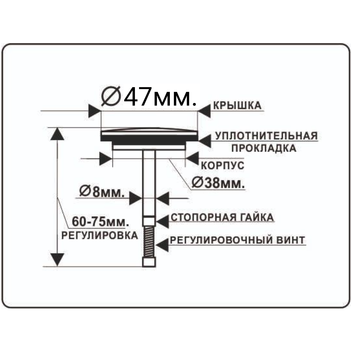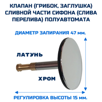 Клапан (затвор) сливной части для сифона (слива перелива) полуавтомата. Изготовлен из латуни с хромированным лицевым покрытием. Подходит для большинства сифонов с грибком (клапаном) диаметром 47 мм. (см. чертёж)