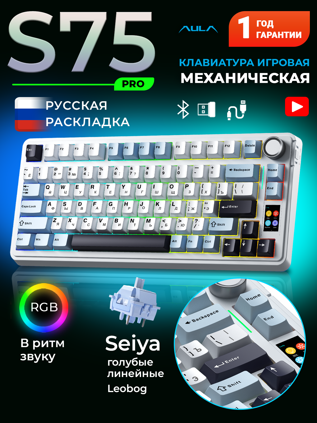 Купить Клавиатура AULA S75 PRO Light Blue-White-Black Purple Seiya Switches, RGB, подключение: провод, Bluetooth,2.4Гц с доставкой по всей России. Клавиатура AULA S75 PRO Light Blue-White-Black Purple Seiya Switches, RGB, подключение: провод, Bluetooth,2.4Гц: сравнение цен, характеристики, фото, актуальное наличие и цены.