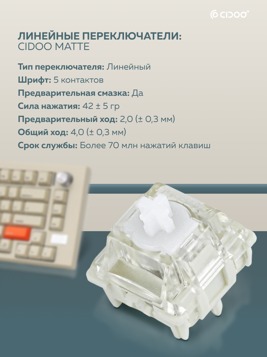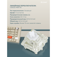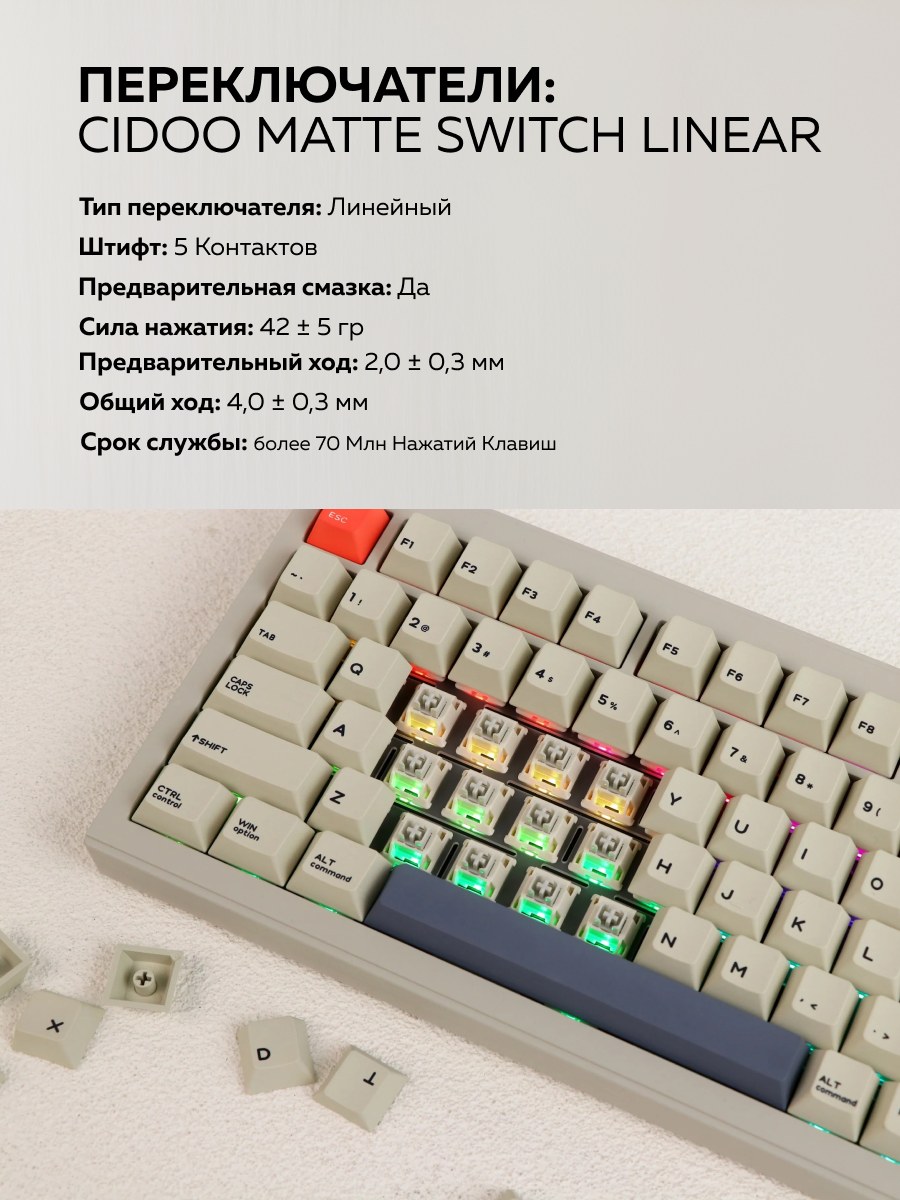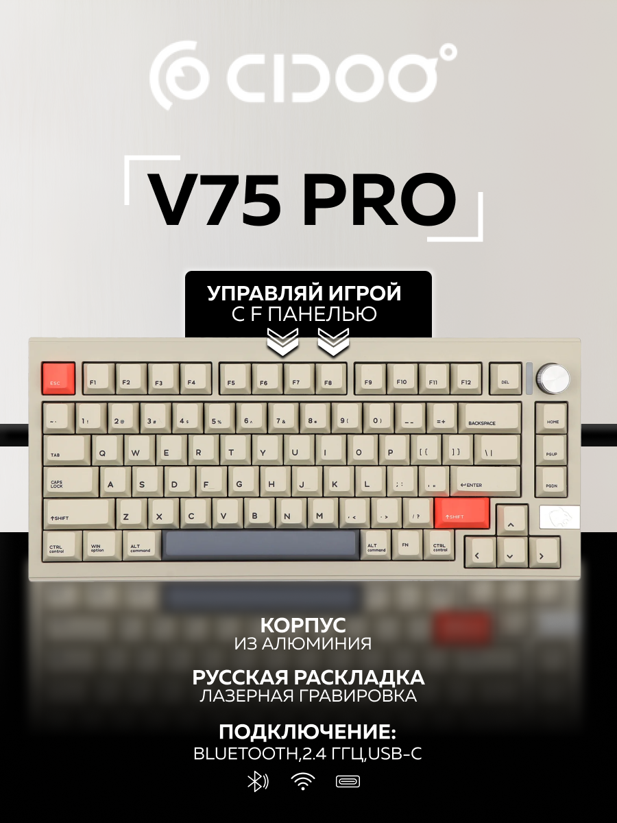 Механическая клавиатура CIDOO V75 оснащена тремя режимами работы - Bluetooth, 2,4 ГГц и USB-C - для универсального и удобного использования. Режимы Bluetooth и 2,4 ГГц позволяют подключаться к нескольким устройствам, а соединение USB-C обеспечивает стабильное и быстрое подключение к компьютеру. Независимо от того, являетесь ли вы геймером, программистом или просто ищете надежную клавиатуру, которая может легко подключаться к нескольким устройствам, механическая клавиатура CIDOO V75 - идеальный выбор для универсального и персонализированного набора текста.
