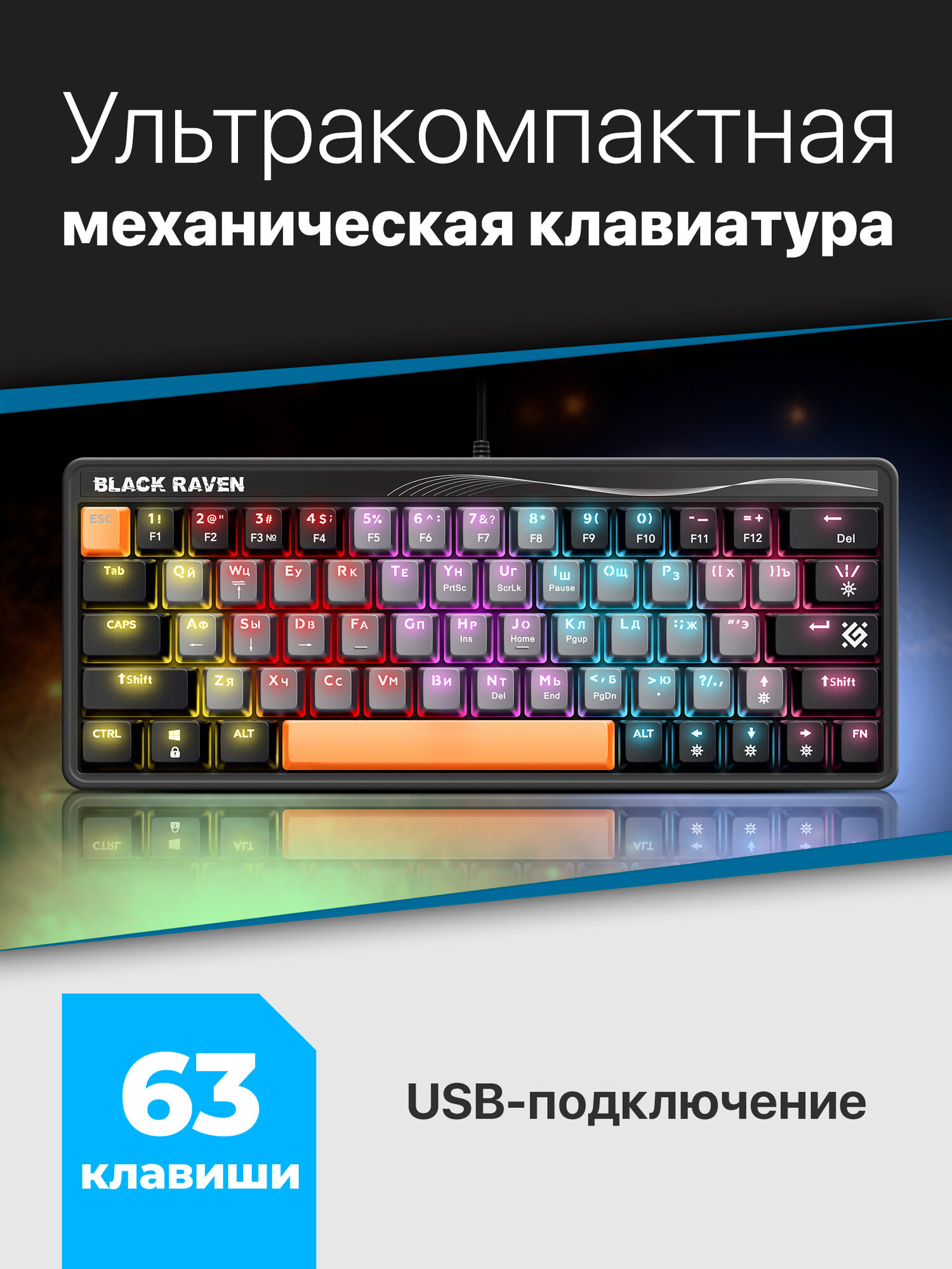 Механическая клавиатура Defender Black Raven GK-417, 3 цвета, радужная подсветка, 63 кнопки