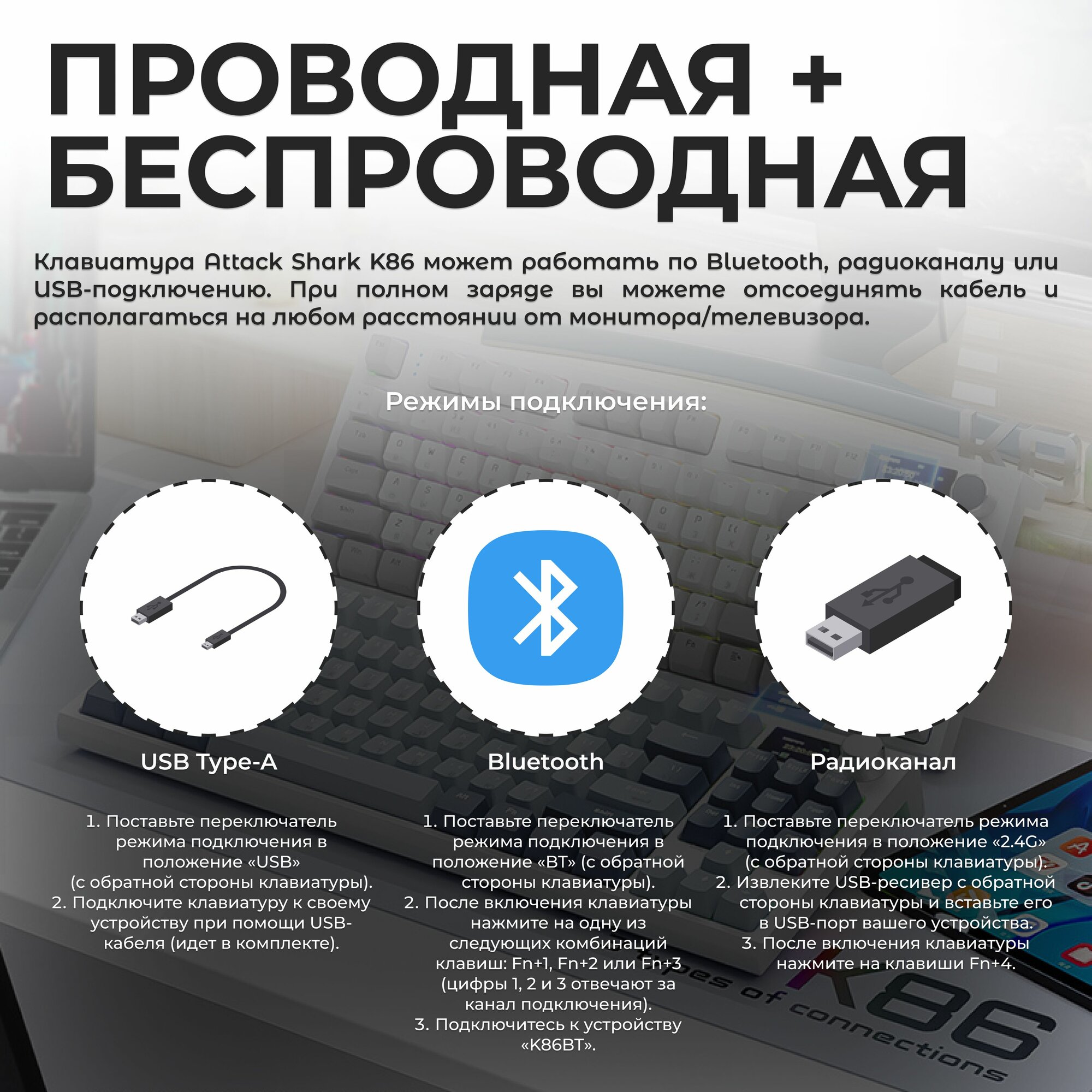 | Комплектация | механическая клавиатура Attack Shark K86 RGB, USB-кабель, руководство пользователя, свитч-пуллер, кейкап-пуллер, 2 запасных свитча |