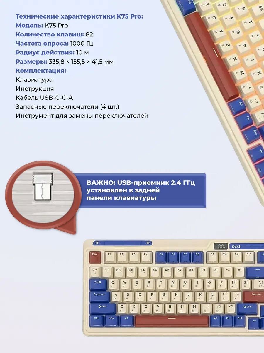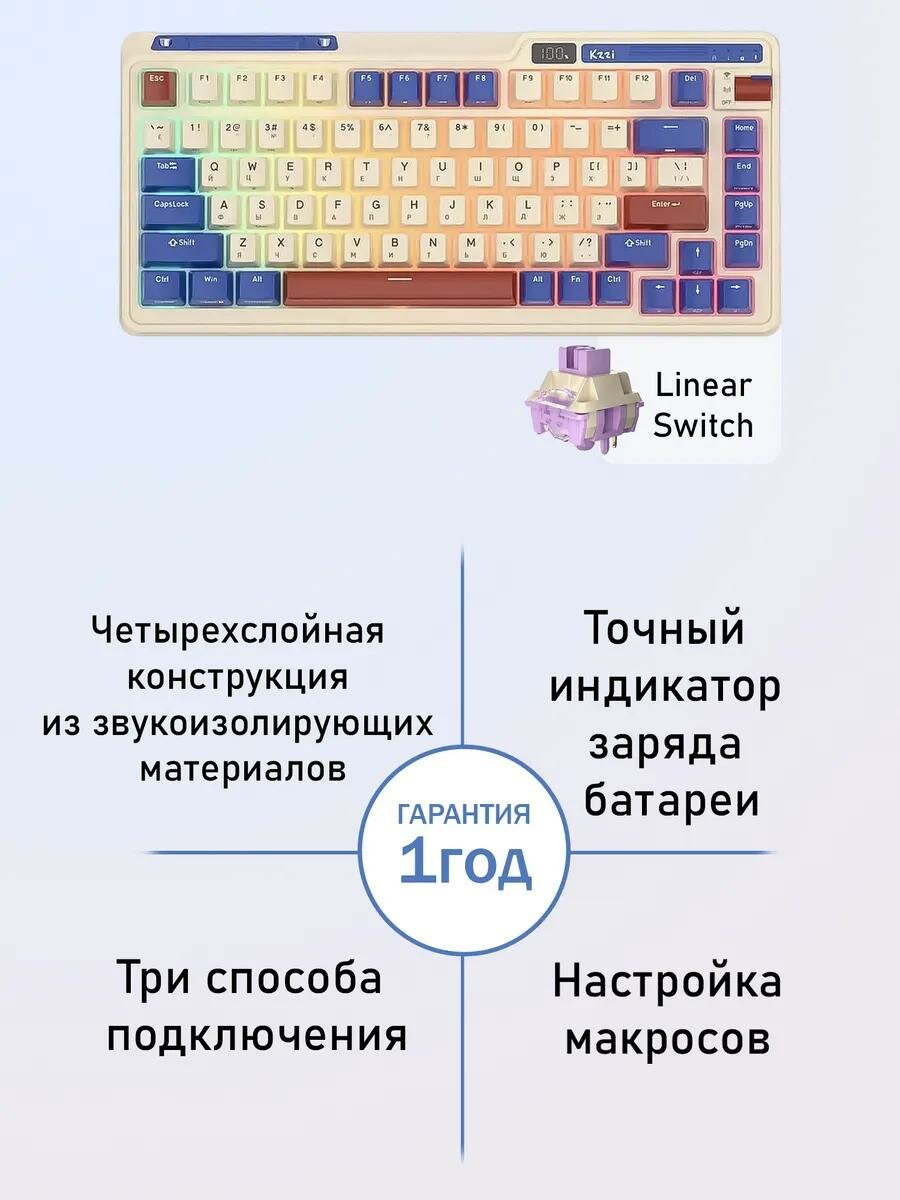 Клавиатура игровая KZZI K75 Pro Rhine Moment Linear Switch, Type C/Type A/Bluetooth/Wi-Fi, 3750мАч, (RU): сравнение цен, характеристики, фото, актуальное наличие и цены.