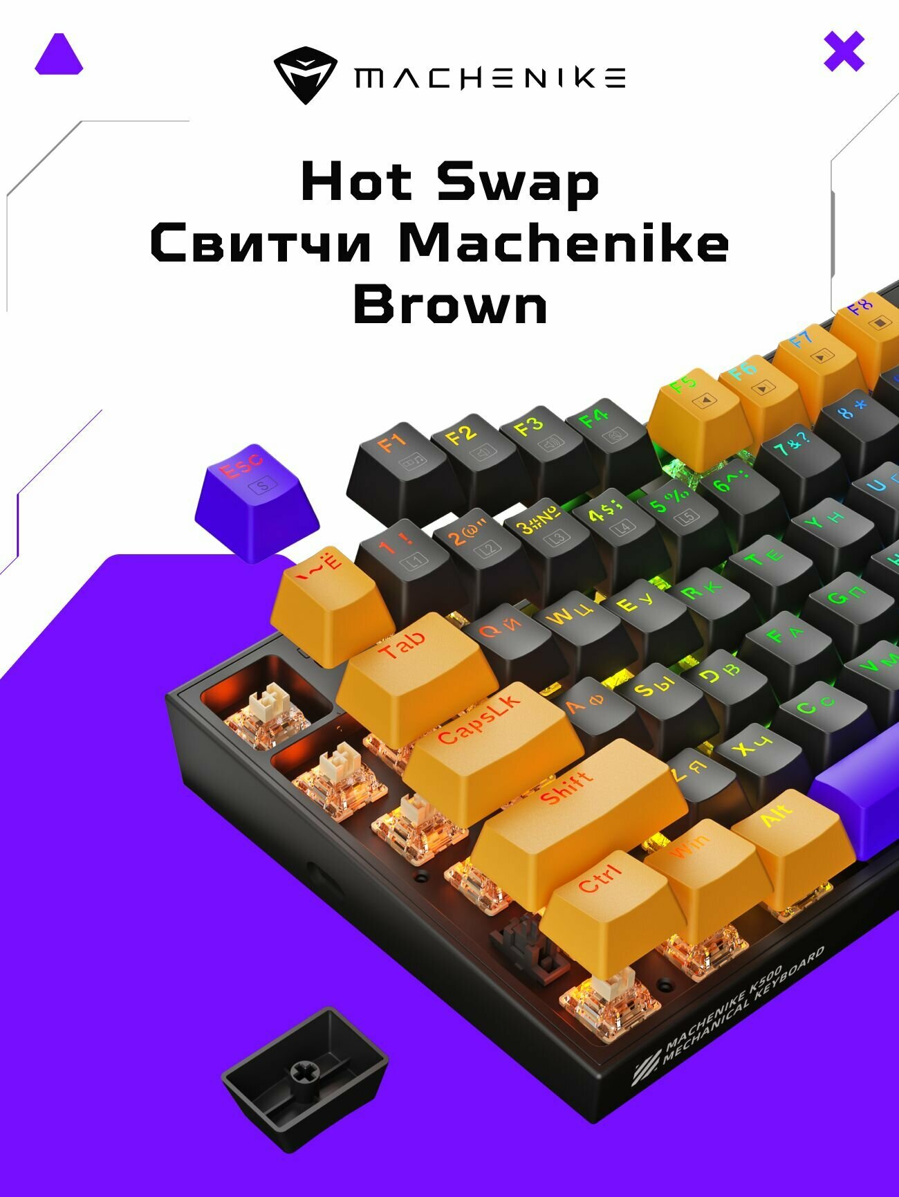 - Благодаря Hot Swap технологии ты можешь менять свитчи по своему вкусу, а предустановленные свитчи Machenike Custom Brown обеспечивают комфортный и отзывчивый отклик.