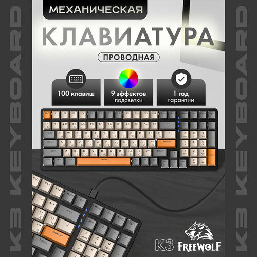 **Клавиатура игровая Wolf K3** - это проводная клавиатура с 100 кнопками и раскладкой на русском языке. Клавиатура имеет черный и оранжевый цвета и оснащена механическими переключателями Red Switch.