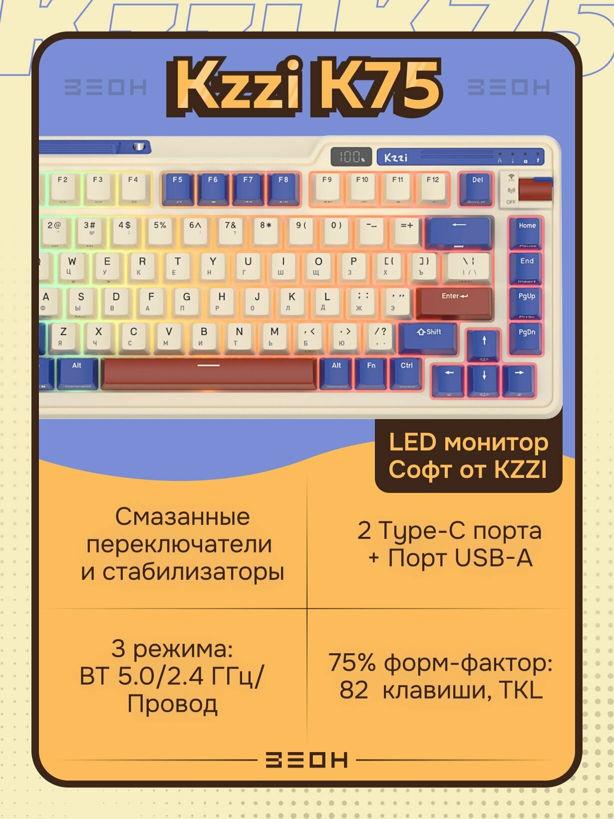 Клавиатура Kzzi K75 PRO Rhine Kzzi Eternity tactile switch, Type C-C-A/Bluetooth/Wi-Fi, 3750мАч, Наклейки с русским макетом: сравнение цен, характеристики, фото, актуальное наличие и цены.
