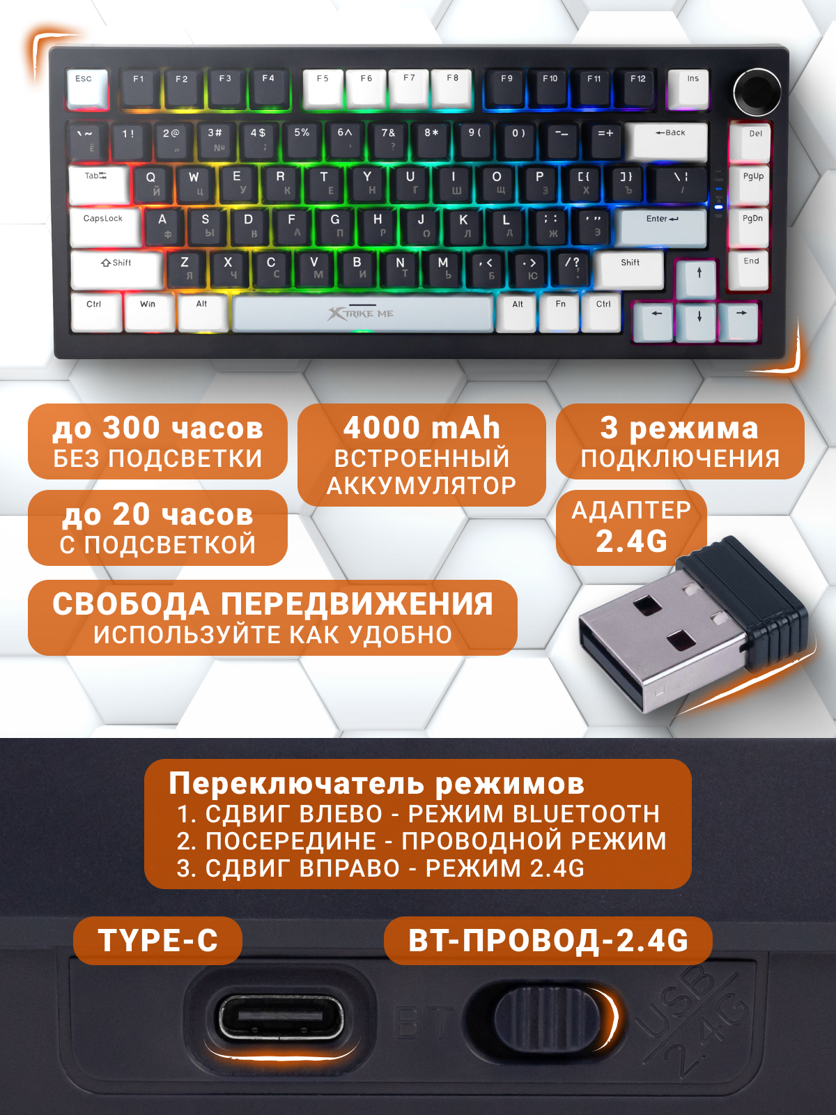 3 режима подключения — USB, 2.4G и Bluetooth;
