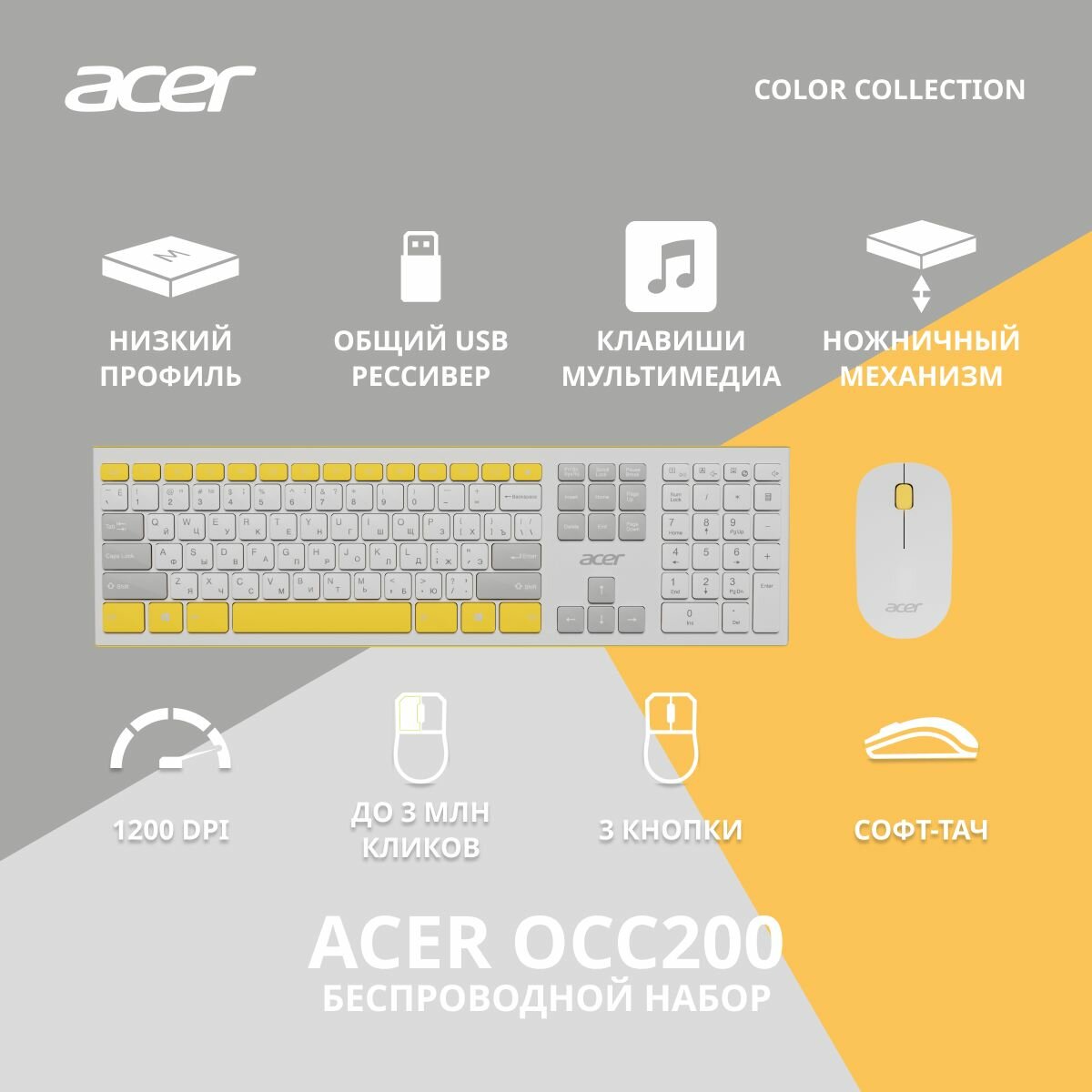 Купить Клавиатура + мышь Acer OCC200 желтый/белый, интерфейс USB, беспроводной, slim-дизайн, Multimedia клавиши (ZL. ACCEE.002) с доставкой по всей России.