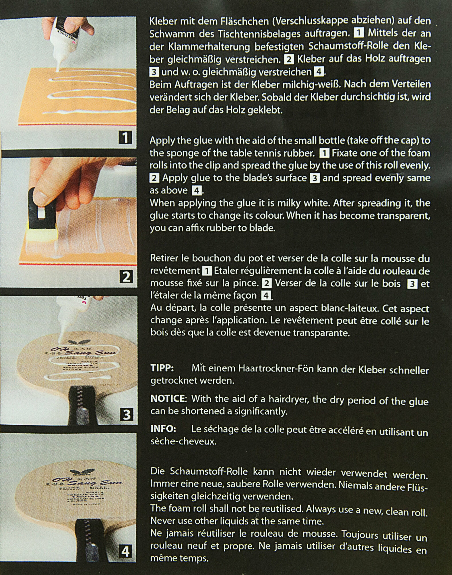 • Встряхните емкость с клеем перед использованием. • Равномерно нанесите клей Butterfly Free Chack на накладку и основание с помощью специального тампона, входящего в комплект. • Дайте клею подсохнуть (не менее 10 минут, поверхность клеевого слоя должна стать полностью матовой) и аккуратно приклейте накладку к основанию (при необходимости с помощью специального валика). • Обрежьте выступающие части накладки.