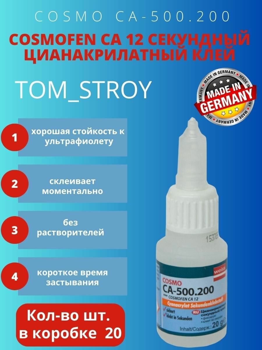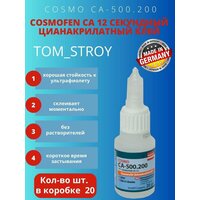 Секундный клей "Cosmofen СА 12" — бесцветный однокомпонентный клеевой состав с моментальным действием: застывает в течение 4-20 секунд в зависимости от температуры окружающей среды.